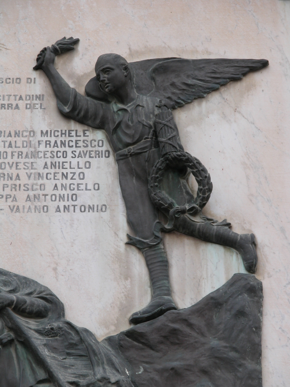 Su una semplice lapide marmorea con alcune brevi iscrizioni è collocato un rilievo in bronzo dall'iconografia interessante: un soldato giace morente con il corpo scomposto dagli ultimi spasmi; sorregge ancora la bandiera che gli copre una parte del corpo, mentre con l'altra mano stringe una bombarda. Ai suoi piedi si trovano un elmetto e i frammenti di armi e strumenti bellici. Da sinistra giunge una figura virile alata, una sorta di Vittoria al maschile, che indossa la divisa militare e reca una corona d'alloro, un fascio littorio ed una fiaccola accesa; si tratta probabilmente di un commilitone del soldato morente, almeno a giudicare dalla divisa e dai calzari che sono della stessa foggia