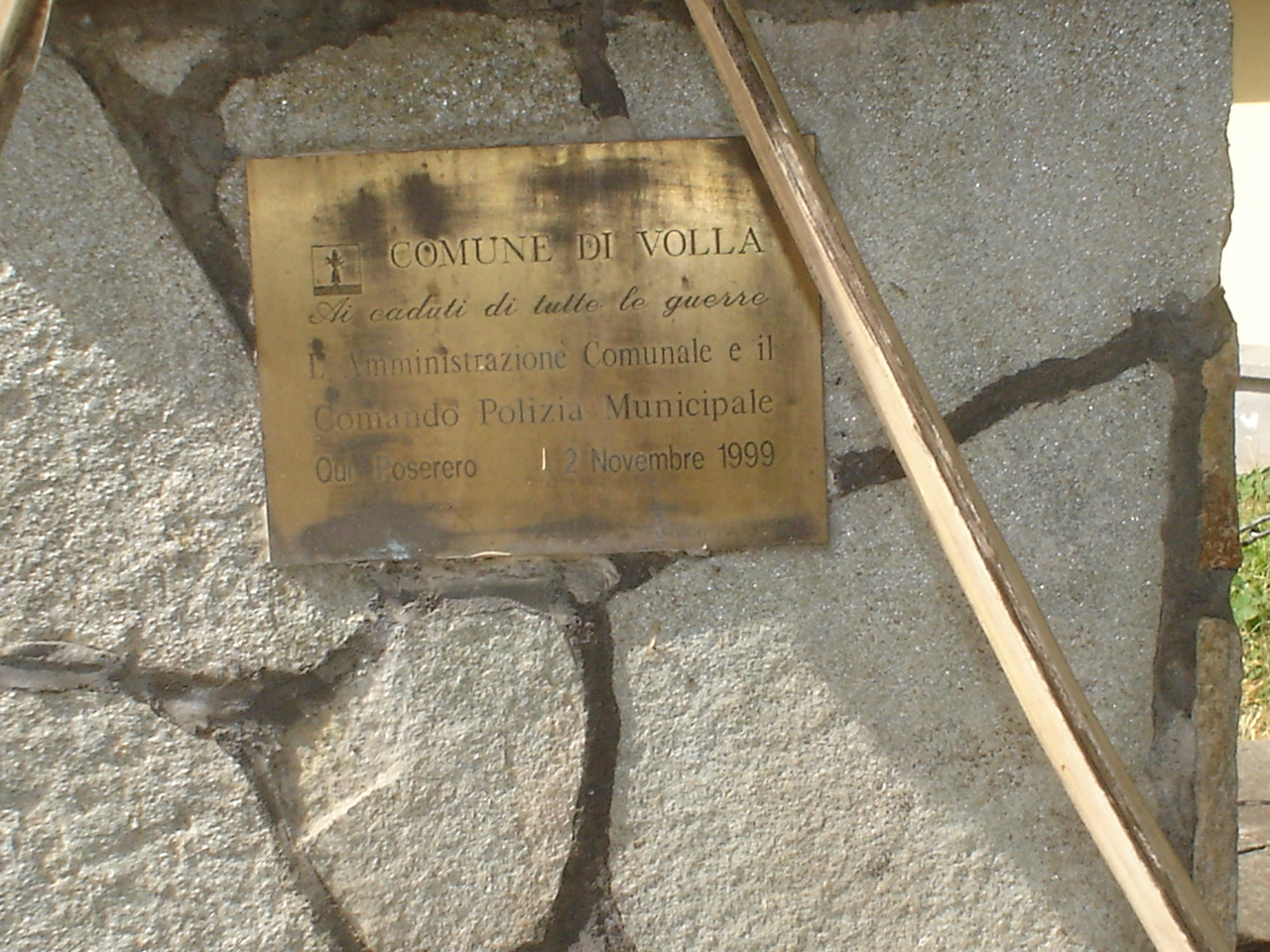 - ISCRIZIONI basamento/ targa/ nel campo - COMUNE DI VOLLA/ AI CADUTI DI TUTTE LE GUERRE/ L'AMMINISTRAZIONE COMUNALE E IL/ COMANDO POLIZIA MUNICIPALE/ QUI POSERO 2 NOVEMBRE 1999// - lettere capitali e corsive -