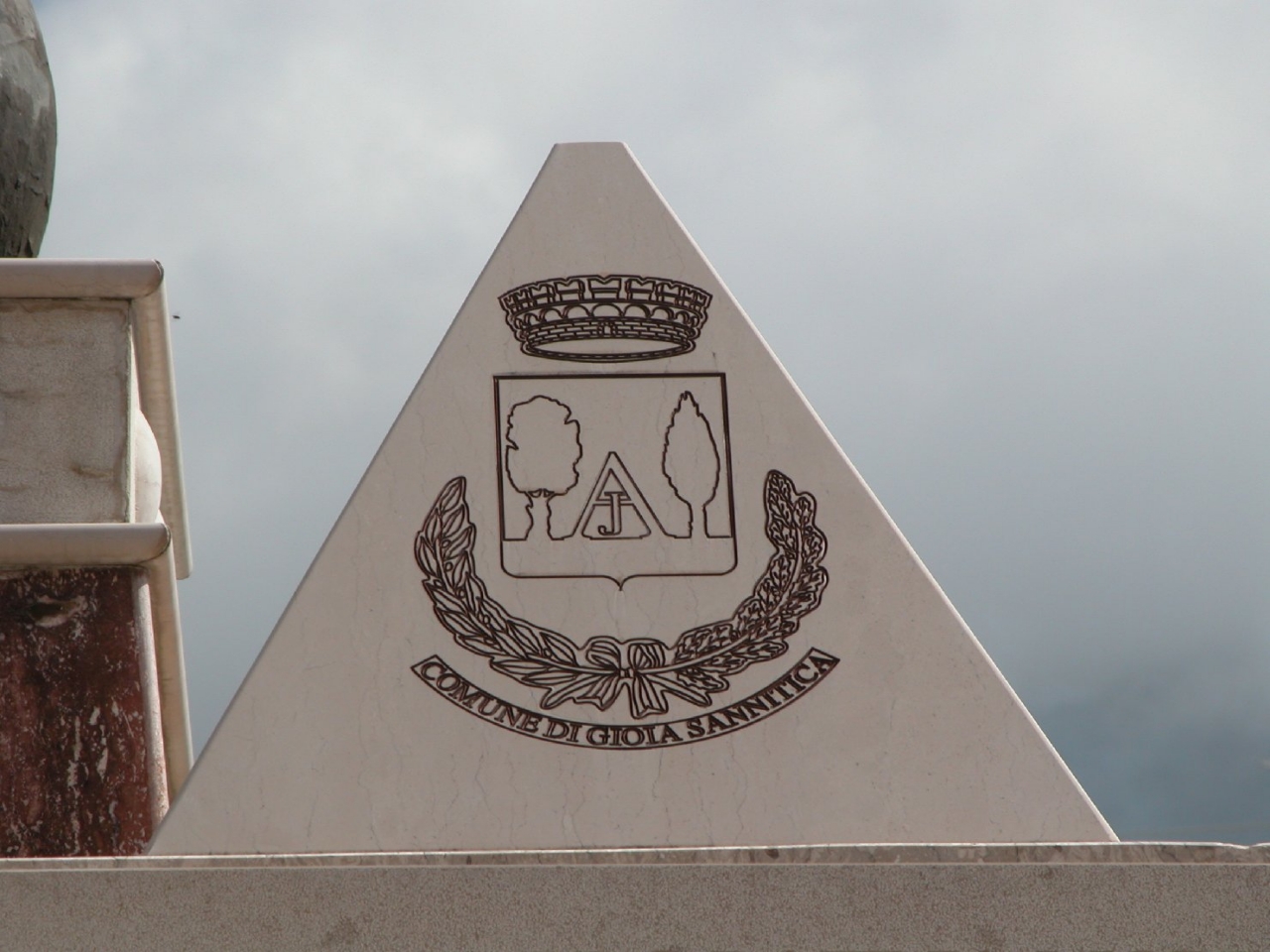 - STEMMI lato frontale/ in alto/ sulla piramide - civile - Stemma - Comune di Gioia Sannitica - Scudo dal fondo azzurro nel cui campo figurano una quercia e un cipresso con al centro una "A" e una "J" sovrapposte, a significare "Ara Jani" (dal tempio in onore di Giano a cui sarebbe legata la fondazione della città) oppure "ARX JOHA" (Arce di Gioia, in merito all'acquisizione del titolo di "Università" del borgo tra il XIV ed il XV secolo)