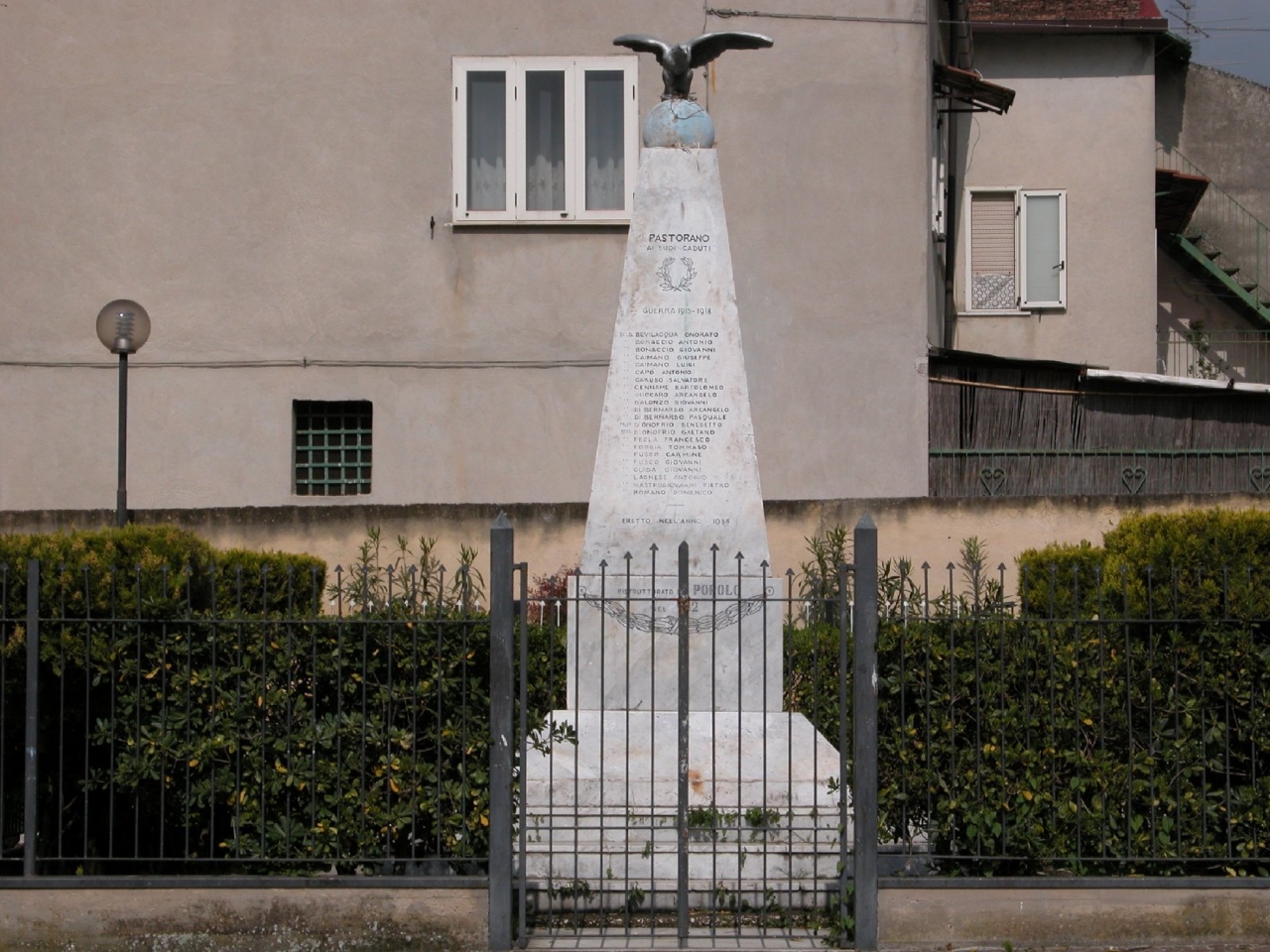 • ISCRIZIONI obelisco/ lato anteriore - PASTORANO/ AI SUOI CADUTI/ GUERRA 1915 – 1918/ SOLD. BEVILACQUA ONORATO/ ‘’ BONCACCIO ANTONIO/ ‘’ BONACCIO GIOVANNI/ ‘’ CAIMANO GIUSEPPE/ ‘’ CAIMANO LUIGI/ ‘’ CAPO ANTONIO/ ‘’ CARUSO SALVATORE/ ‘’ CENNAME BARTOLOMEO/ ‘’ CUCCARO ARCANGELO/ D’ALONZO GIOVANNI/ ‘’ DI BERNANRDO ARCANGELO/ ‘’ DI BERNARDO PASQUALE/ ML.LO D’ONOFRIO BENEDETTO/ SOLD. D’ONOFRIO GAETANO/ ‘’ FEOLA FRANCESCO/ ‘’ FOGGIA TOMMASO/ ‘’ FUSCO CARMINE/ ‘’ FUSCO GIOVANNI/ ‘’ GUIDA GIOVANNI/ ‘’ LAGNESE ANTONIO/ ‘’ MASTROGIOVANNI PIETRO/ ‘’ ROMANO DOMENICO/ ERETTO NELL’ANNO 1958/ RISTRUTTURATO DAL POPOLO/ NEL 1982// - lettere capitali -