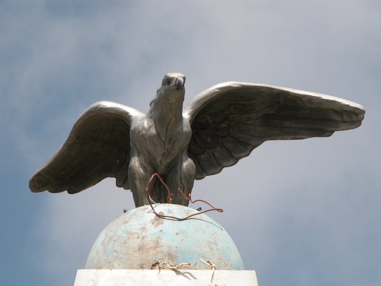 • NOTIZIE STORICO CRITICHE L'aquila sembrerebbe ricoperta di una patina bianco-argentea, forse conseguenza del restauro avvenuto nel 1982. La sistemazione al centro di una siepe recintata, quale punto focale di uno spazio viabilistico, sembra essere tradizione orale di quel processo volto a ribadire i legami della comunità con i propri morti, al tempo stesso definendone i reciproci confini spaziali. Negli ultimi anni del primo decennio del XXI secolo, l'opera ha subito un nuovo restauro, che l'ha privata delle incisioni sul marmo a favore di lapidi bronzee poste sui lati del basamento