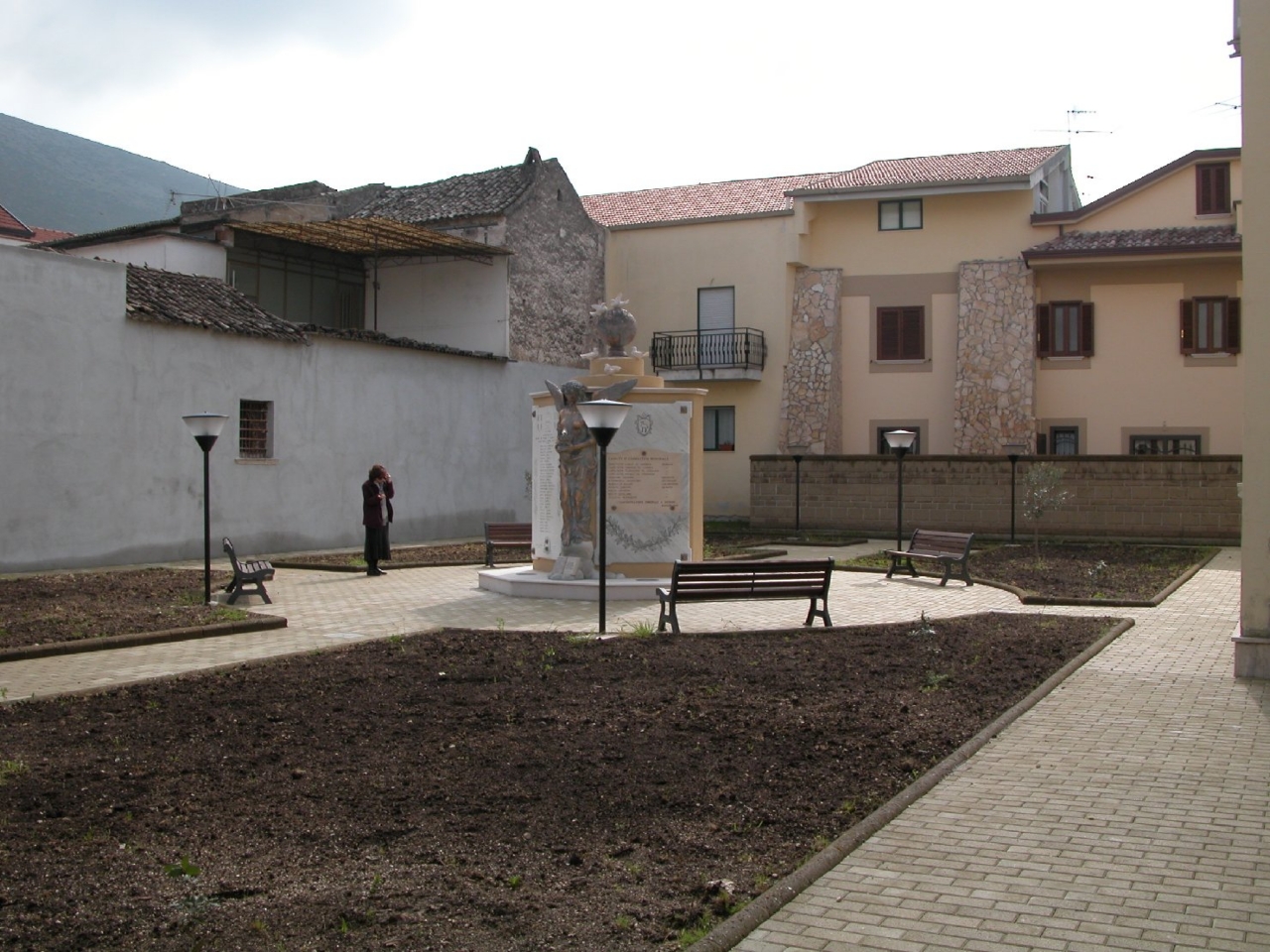 Addossate ad una struttura poligonale in muratura, le lapidi commemorative della prima e seconda guerra mondiale, sono separate da una figura femminile bronzea a mezzotondo con in capo una corona di alloro e nelle mani una lampada votiva; la base è in forma di tumulo di pietre con un libro aperto. Sulla sommità un globo terrestre in bronzo e colombe bianche. La lapide della prima guerra mondiale è decorata ad incisione con, in basso, una corona di alloro. Ai lati rami di alloro, in alto due stemmi sabaudi con al centro un elmetto e due fucili incrociati. La lapide è stata collocata in uno spazio interno, tra palazzi, suddiviso in quattro aiuole, con quattro panchine e piccoli lampioni