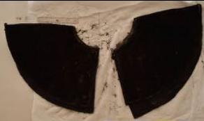 - NOTIZIE STORICO CRITICHE Le due falde si compongono di tre pezzi ciascuna (fodera esterna, imbottitura, fodera interna) per un totale di sei pezzi. Le falde dovevano essere cucite al saio in corrispondenza della vita, scendendo morbide lungo le brache. Inoltre i due elementi presentano una parte anteriore più corta rispetto a quella posteriore, per assecondare le diverse lunghezze del busto. La falda destra presenta il taglio verticale di una tasca. (BIBR: Orsi Landini Roberrta 2011)