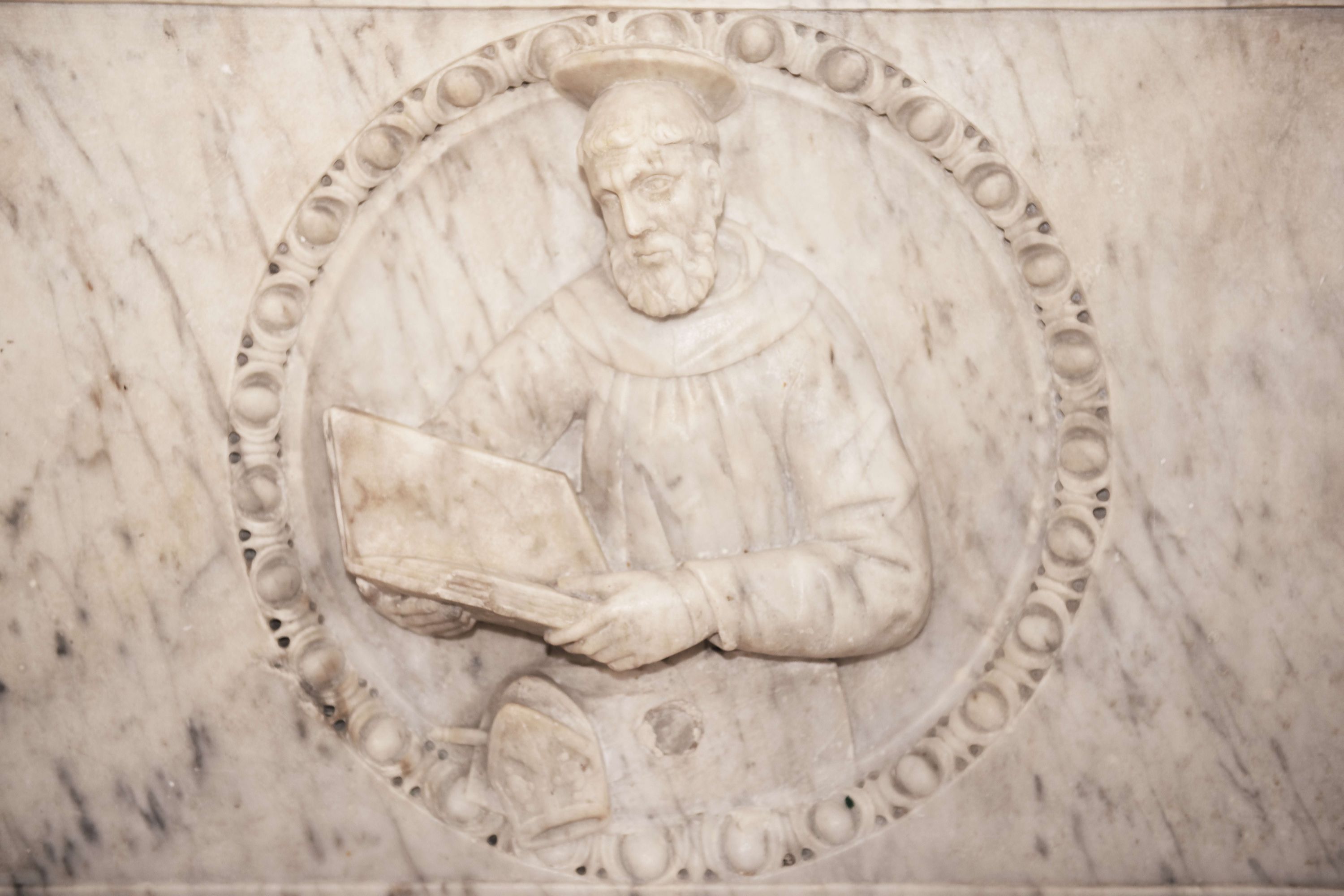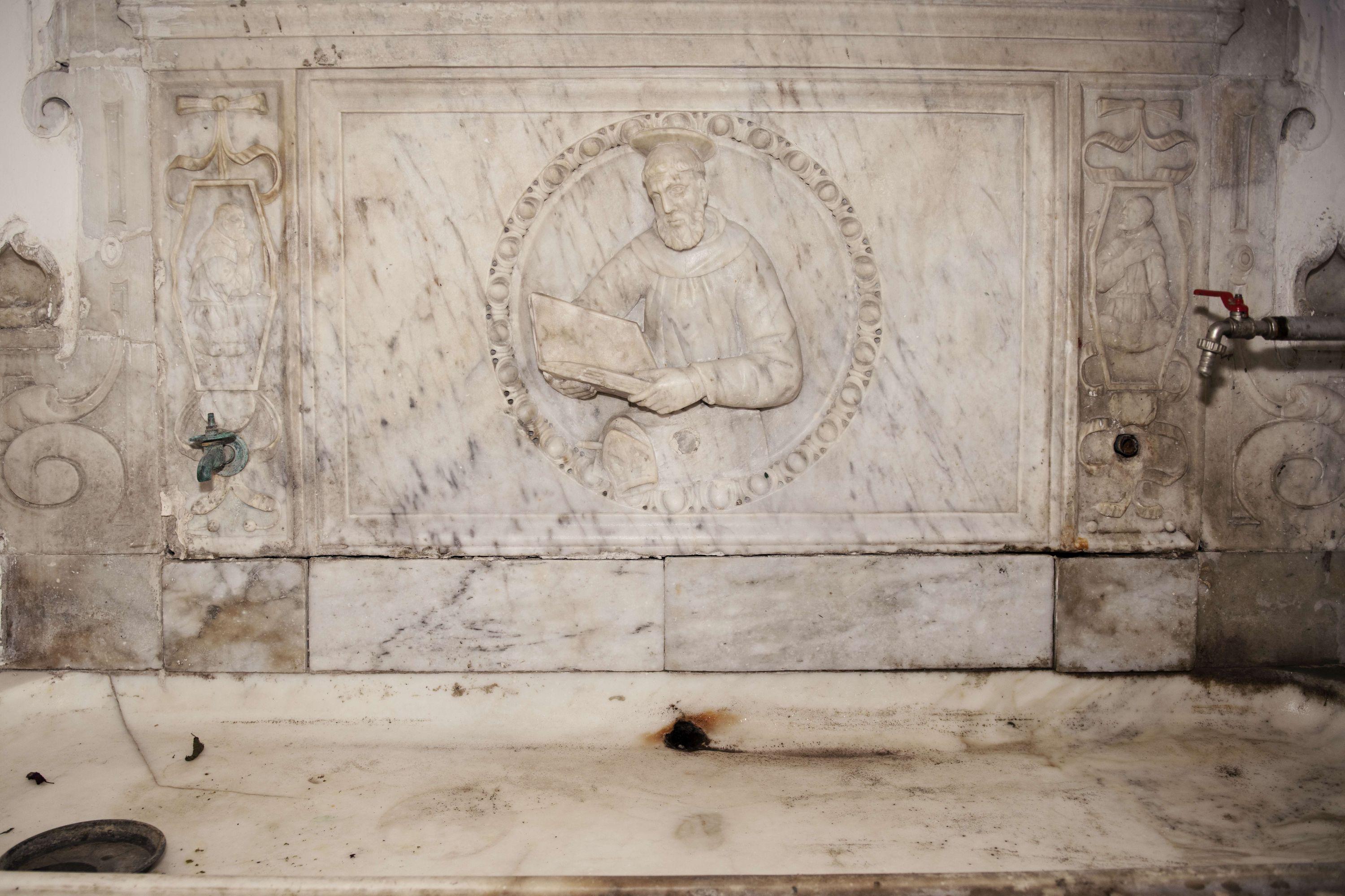 Il lavabo presenta una vasca e dossale con medaglione a rilievo che raffigura il busto di Sant'Agostino. Questi è rappresentato col saio e aureola, in atto di leggere e con la mitra sul margine inferiore.Ai lati, inquadrati in cornici con nastro, due figure di frati agostiniani oranti