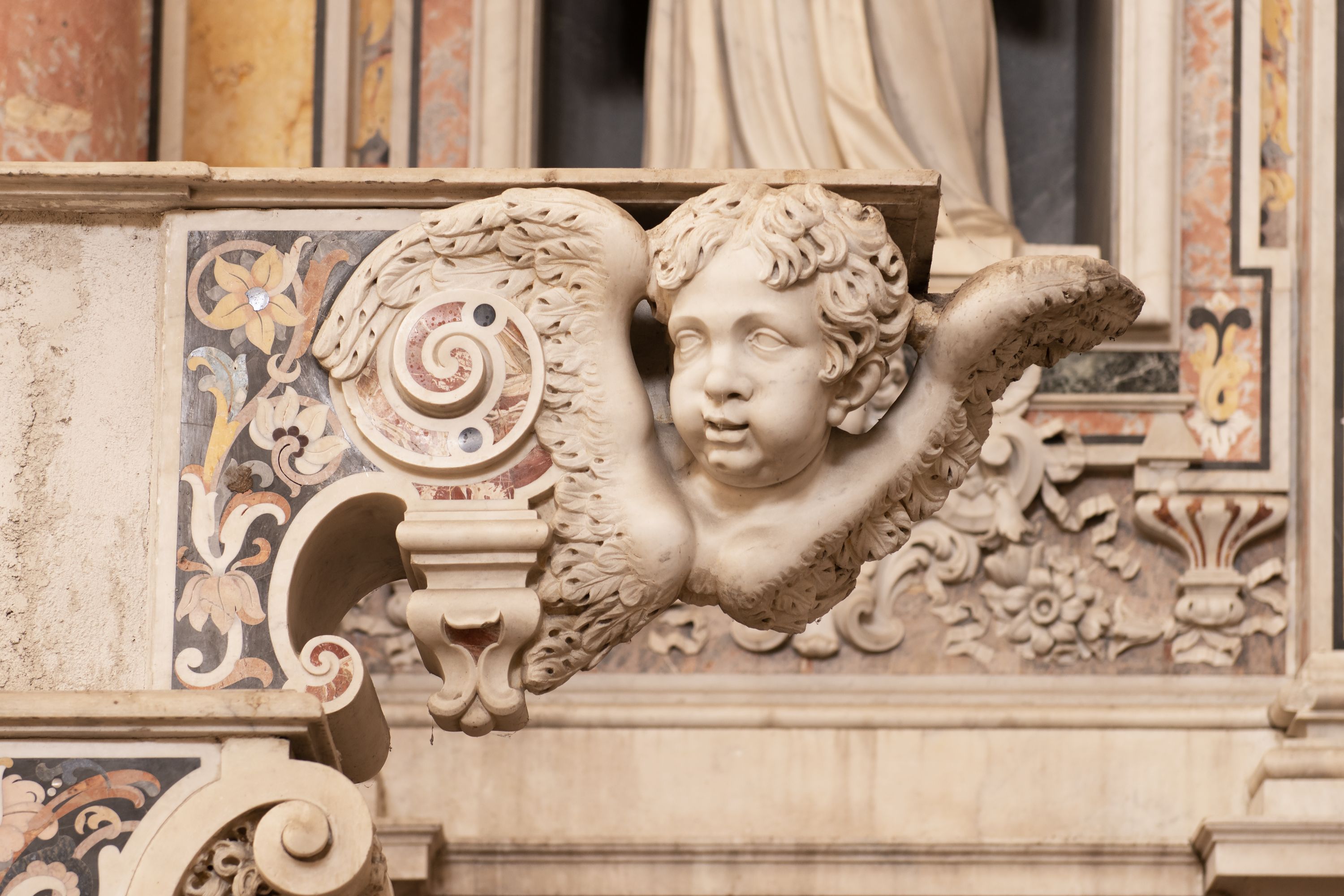 - NOTIZIE STORICO CRITICHE L'altare, eseguito tra il 1640-1641 ad opera di vari marmorari, tra cui Dionisio Lazzari, fu completato poi nel 1698 con l'assistenza di Arcangelo Guglielmelli.Lo stato conservativo dell'oggetto è piuttosto cattivo, essendo stato oggetto di furto vandalico e ricoperto di particellato atmosferico e colature di cemento