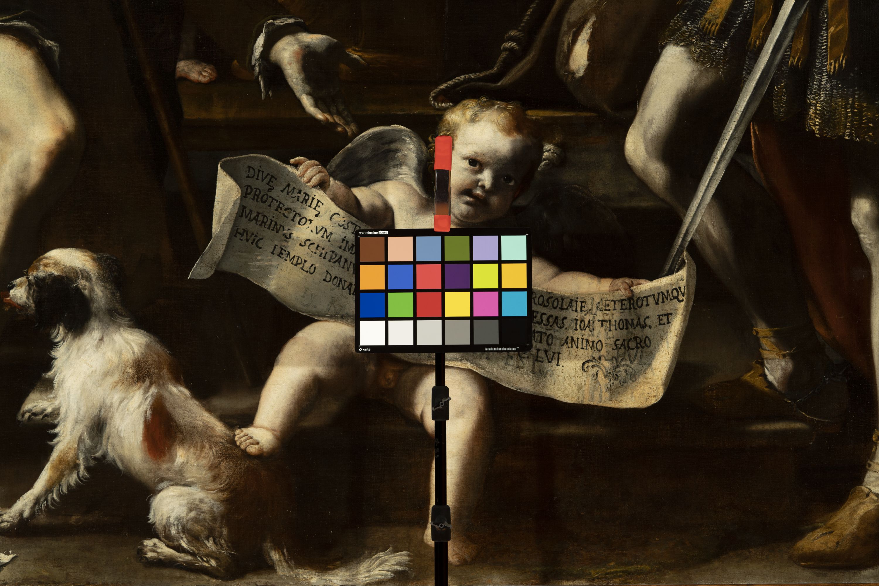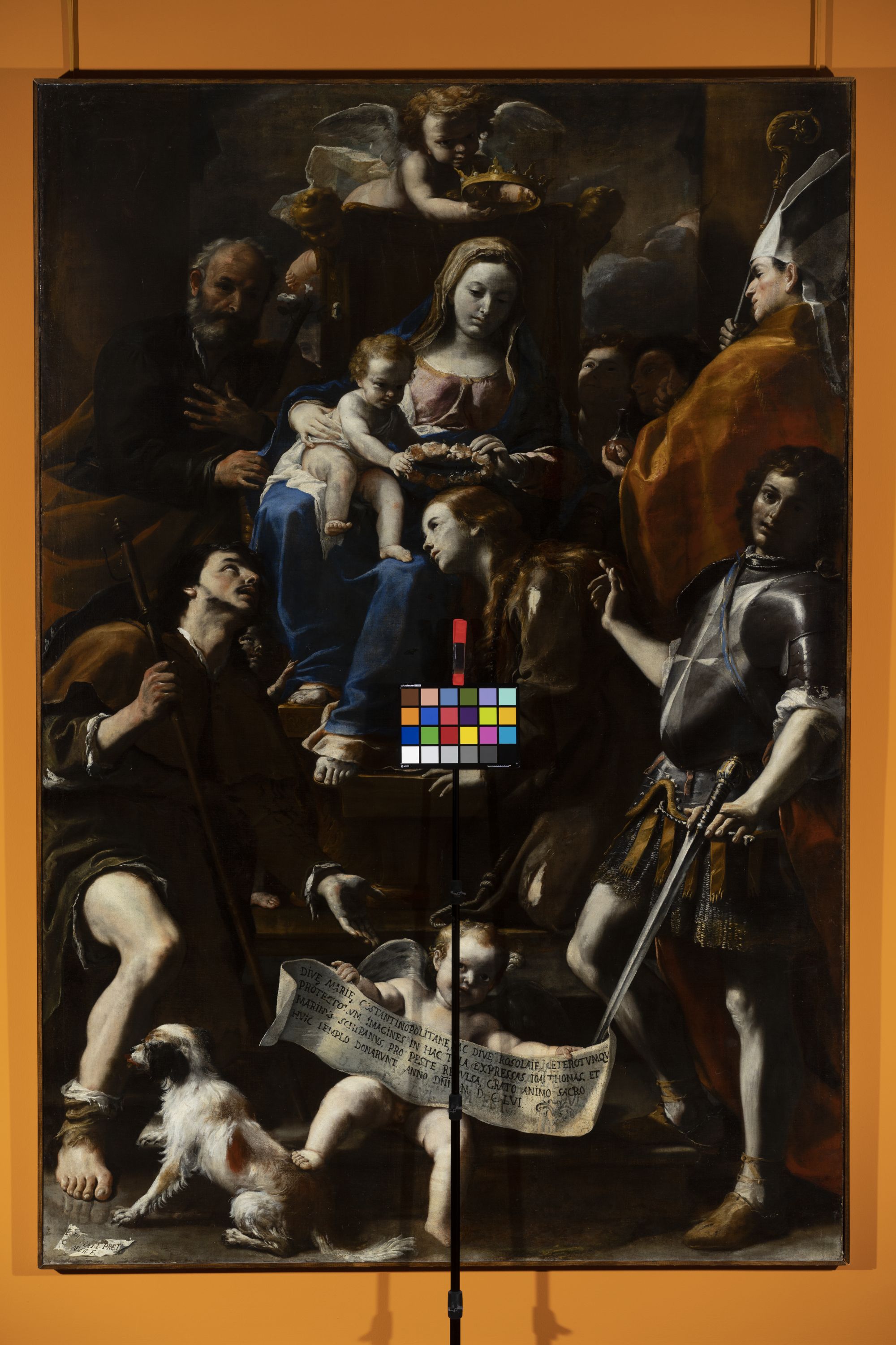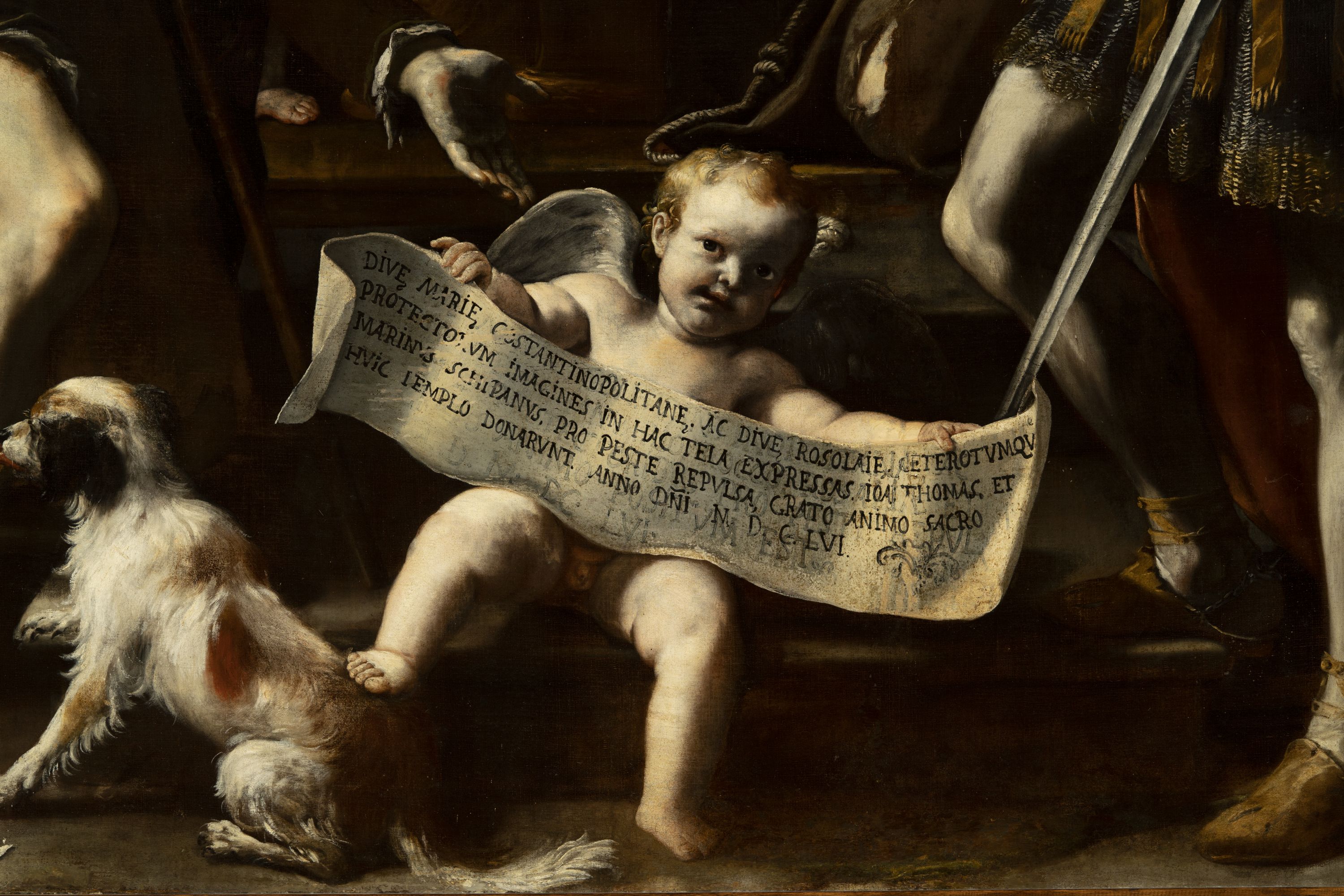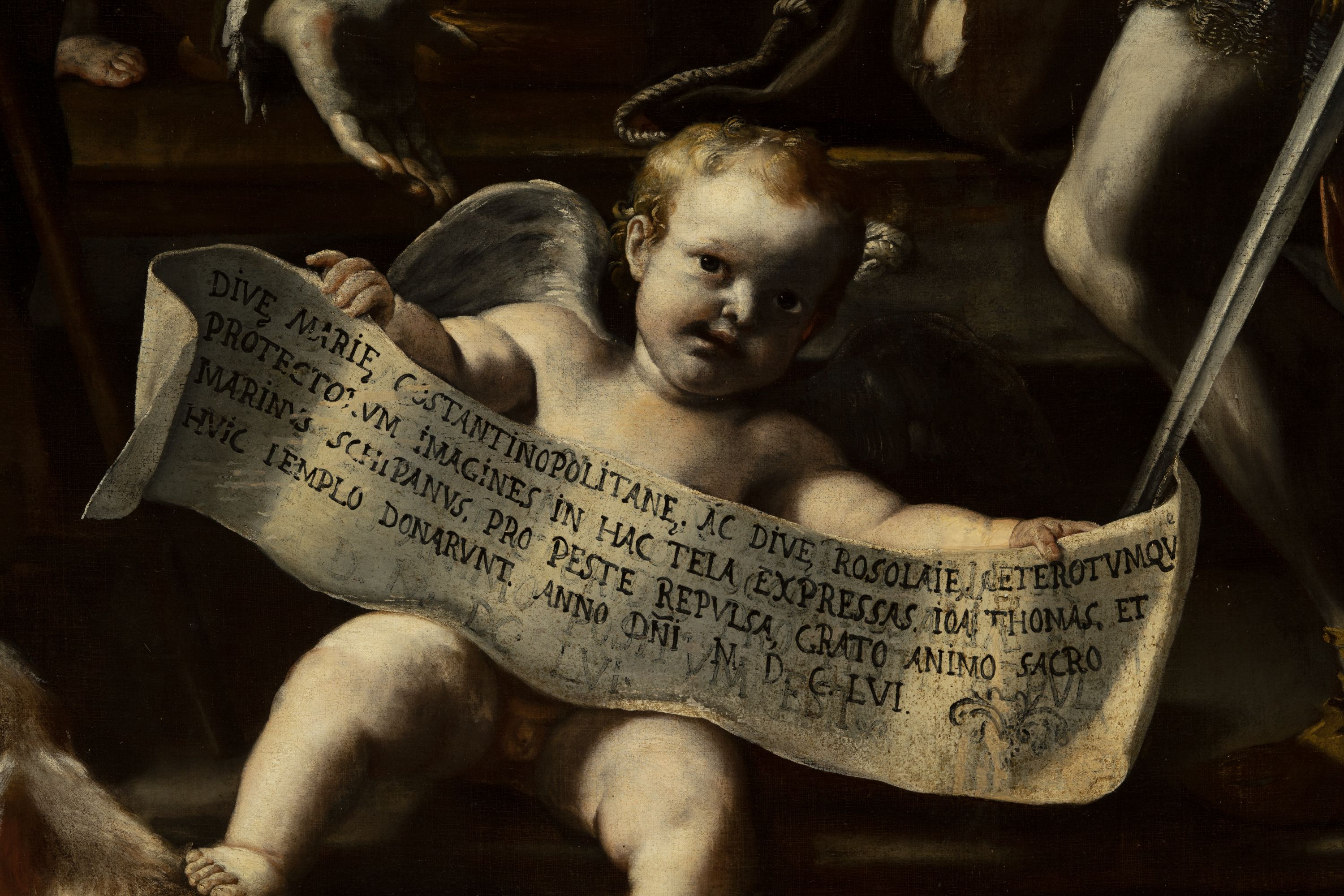 - ISCRIZIONI in basso al centro - DIVE MARIE COSTANTINOPOLITANE AC DIVE ROSALIE CETEROTUMQUE/ PROTECTORUM IMAGINES IN HAC TELA EXPRESSAS IOA. THOMAS ET/ MARINUS SCHIPANUS PRO PESTE REPULSA GRATO ANIMO SACRO/ HUIC TEMPLO DONARUNT ANNO DNI MDCLVI -