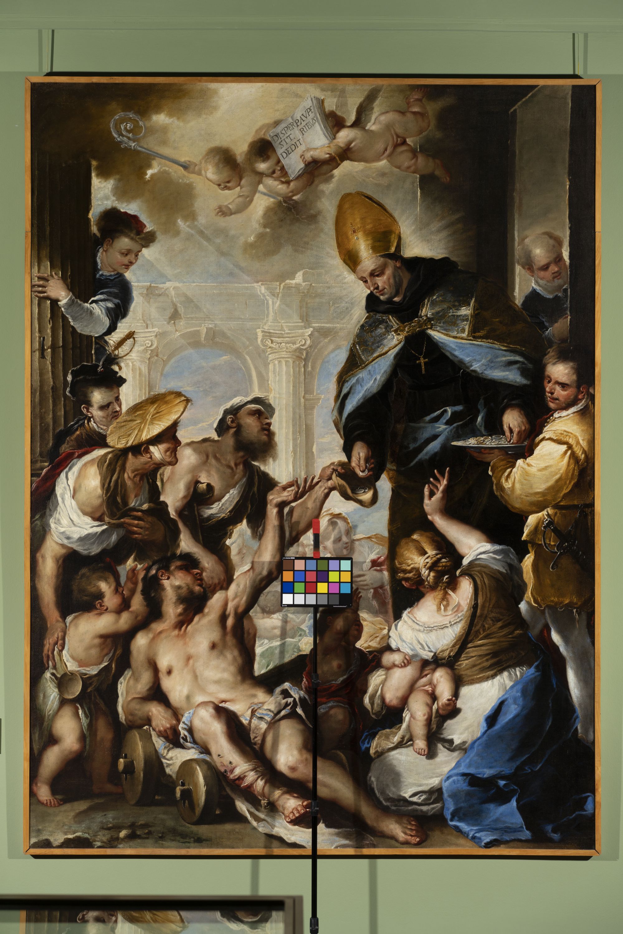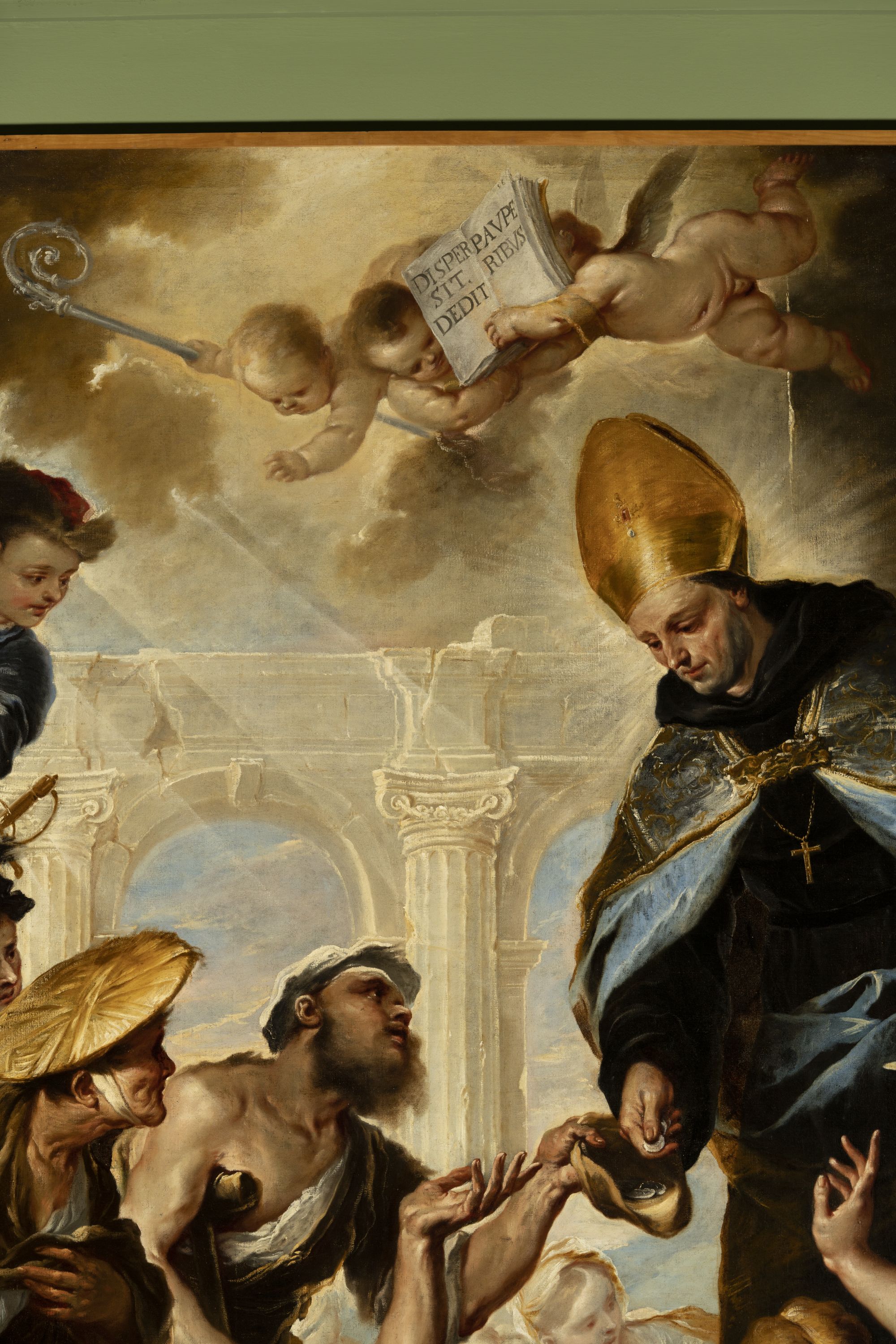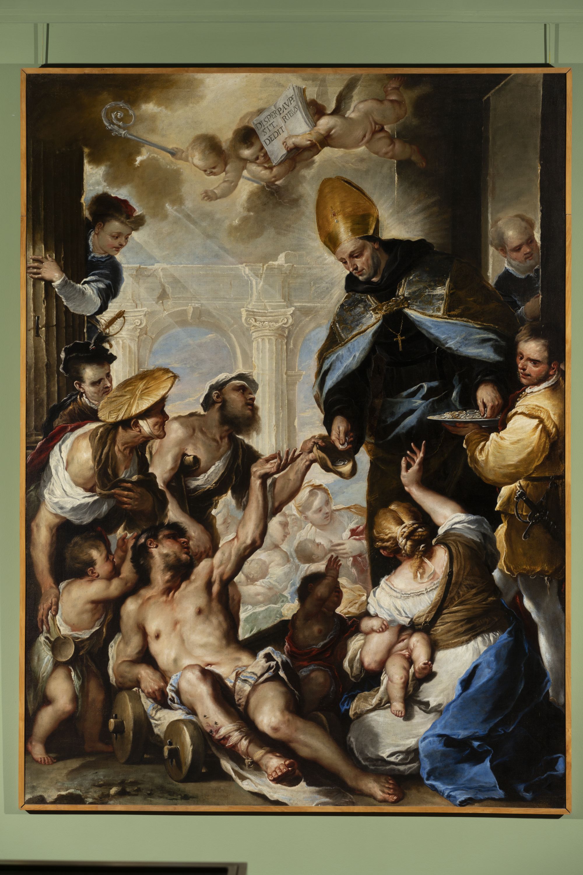 - NOTIZIE STORICO CRITICHE Questa pala fu commissionata nel 1658 dalla comunità agostiniana per festeggiare la canonizzazione, voluta da Alessandro VII, di Tommaso da Villanova, monaco agostiniano spagnolo tra i principali riformatori del suo ordine dopo il Concilio di Trento. La committenza includeva un'altra cona, l'"Estasi di San Nicola da Tolentino", firmata e datata al 1658, che Giordano eseguì imitando la maniera del Veronese.Nella tela in esame la figura del mendicante disteso è una esatta citazione del "Martirio di San Lorenzo" di Tiziano della chiesa dei Gesuiti a Venezia.Gli accenti neoveneti hanno suggerito a Pallucchini un influsso dei modi di Sebastiano Mazzoni.Un disegno preparatorio per l'Elemosina di San Tommaso da Villanova è a Frederickssund