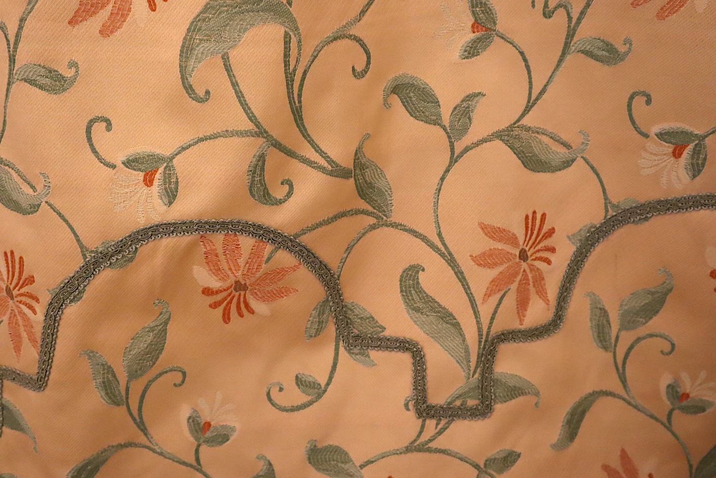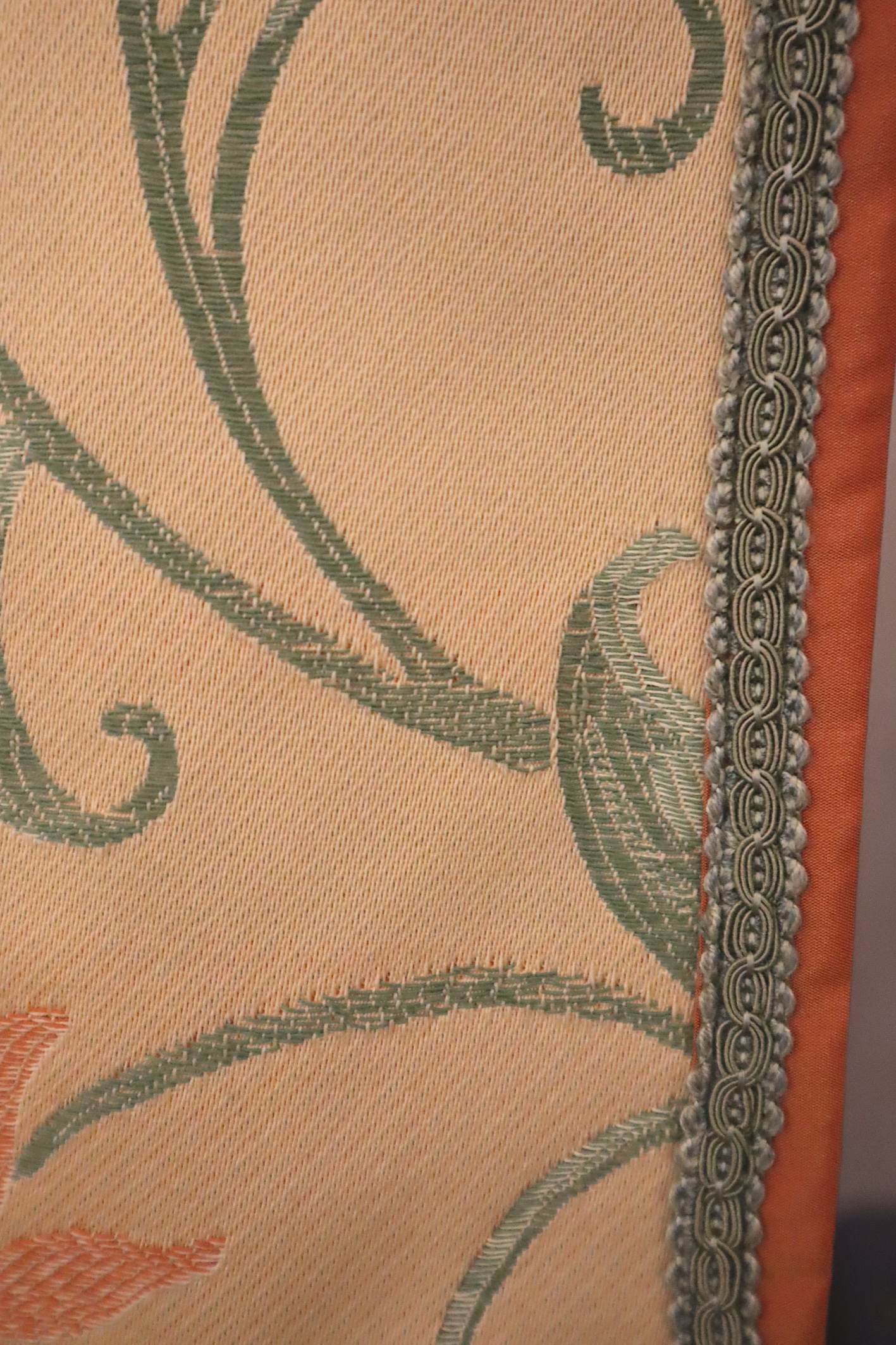 Parokhet in gros de tours con trame broccate. Disegno a esili tralci verdi da cui fiori di color rosa e pistilli rossi con andamento sinuoso a sviluppo verticale. Al centro cratiglio in seta arancio con iscrizione sacra ricamata a punto reale bordata da cornice in filo d'oro a punto a catenella e da banda in mereletto in filo di seta verde tessuto al telaio. Mantovana e tenda decorate da gallone in filo di seta grigio scuro. Fodera in raso color arancio