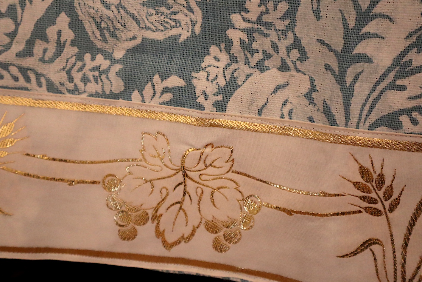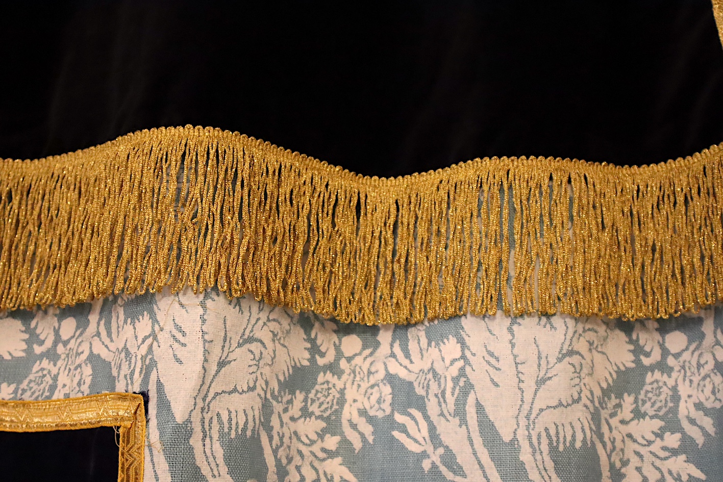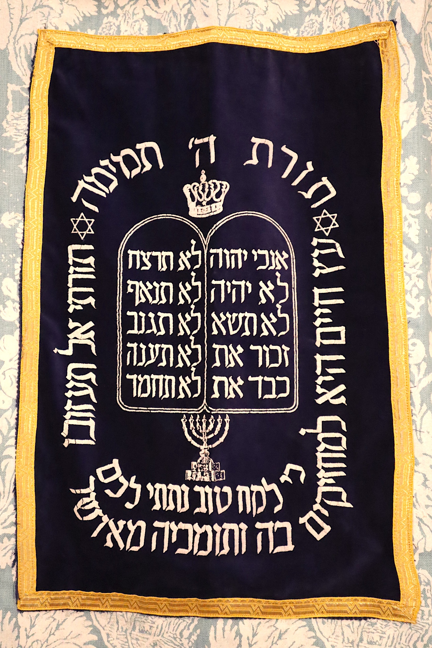 Parokhet in spessa tela di cotone azzurro cielo, incorniciata da una larga fascia perimetrale, decorata a stampa con uso di matrice a motivi botanici in color bianco. Al centro un cartiglio in velluto tagliato blu notte, bordato da stretta fascia metallica in filo d'oro, ornato con la rappresentazione nei toni del bianco delle Tavole delle Leggi sormontate da una tiara, sostenute da una menorà e circondate da versetti sacri relativi alla Torà. Superiormente mantovana in velluto tagliato blu con grossa frangia a gonna ritorta in canutiglia dorata su anima gialla. Inferiormente un'alta banda in tessuto di cotone avorio con ricamo a punto reale in canutiglia d'oro. Fodera in cotone bianca