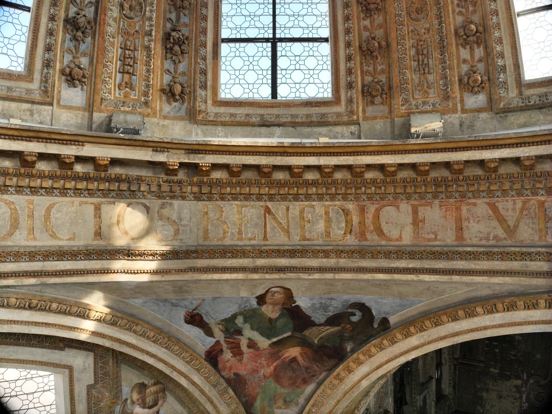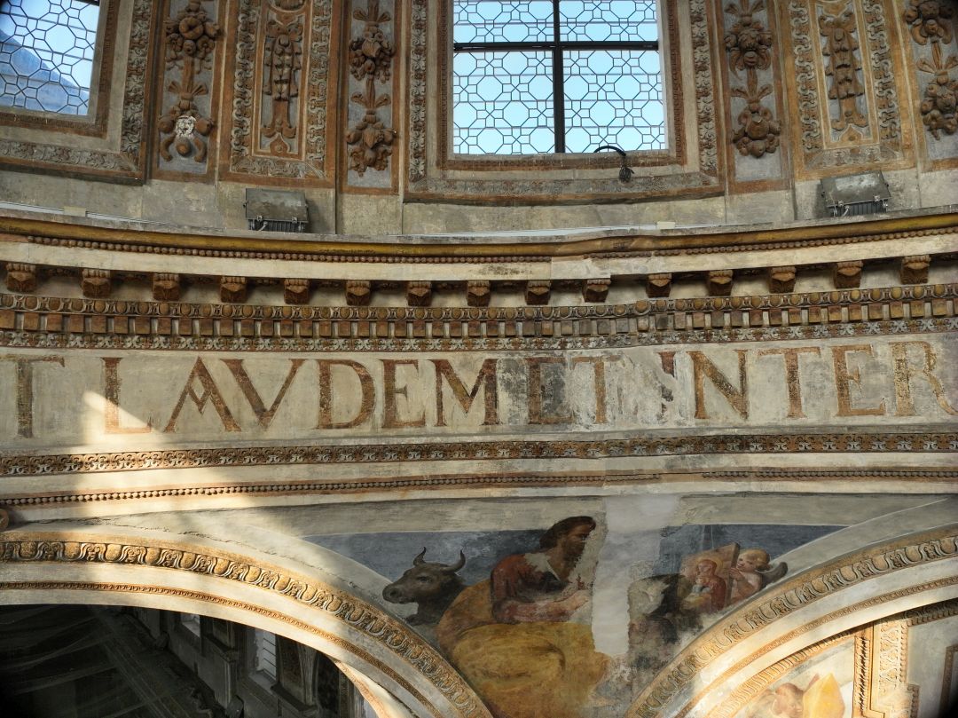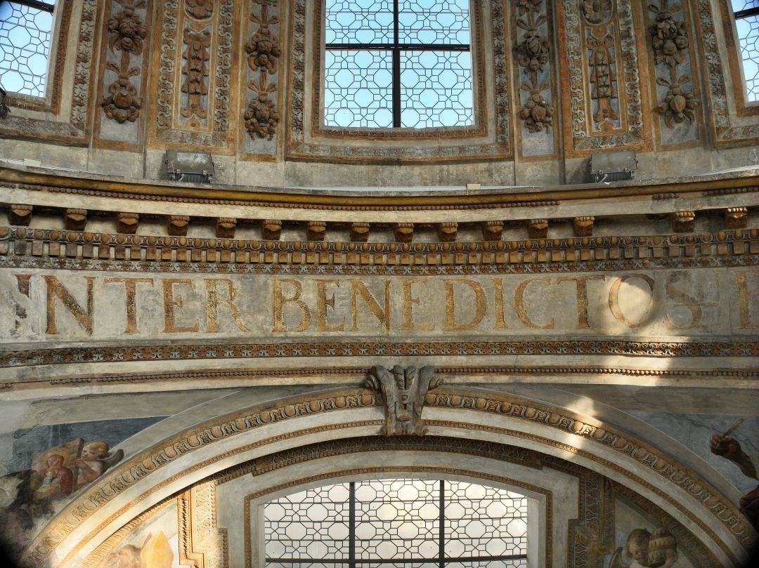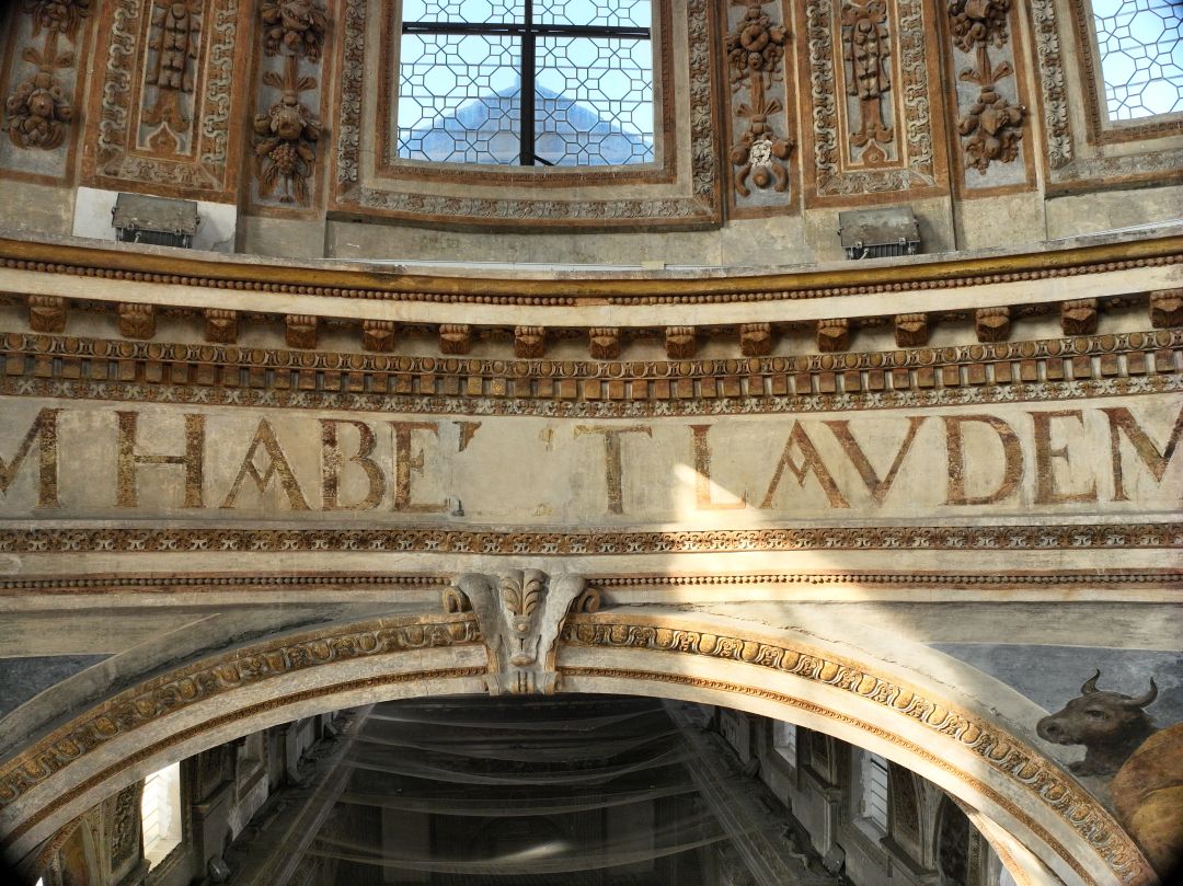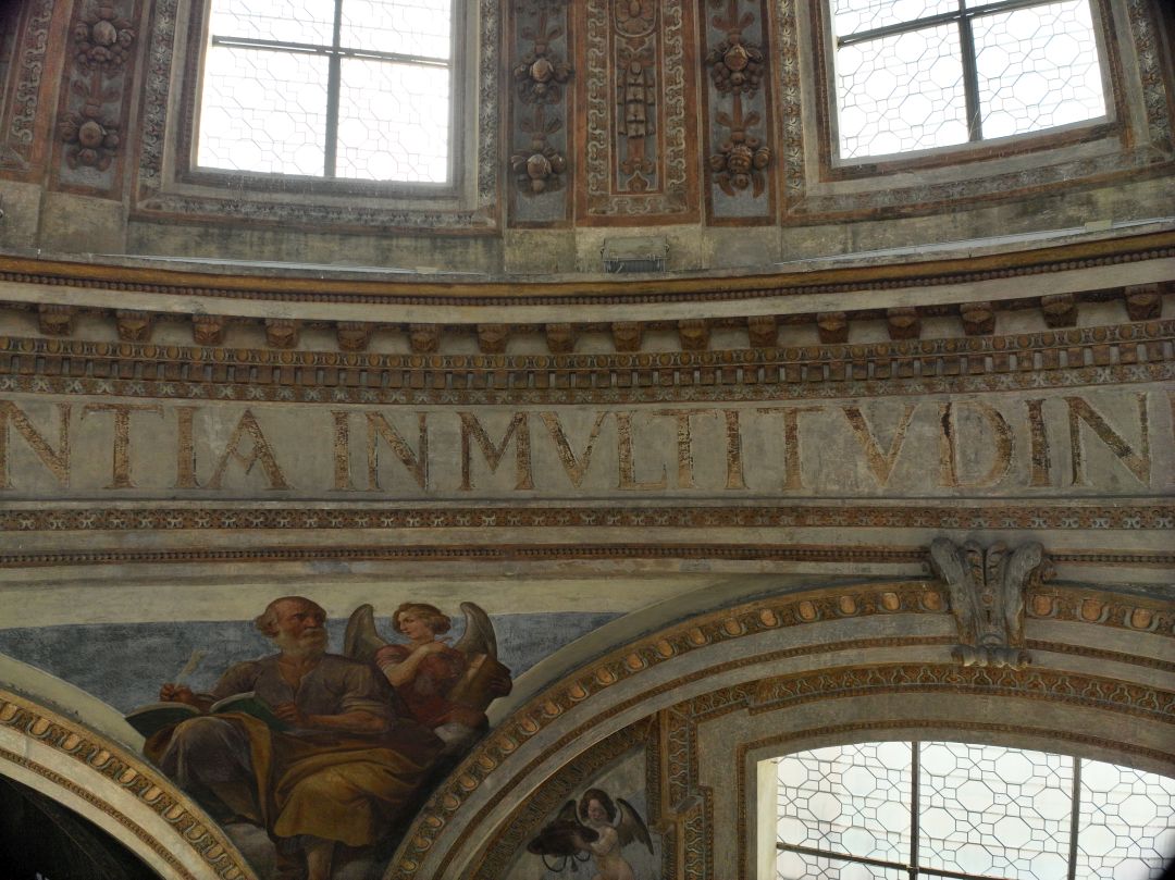 - NOTIZIE STORICO CRITICHE Al di sopra degli archi di imposta della cupola corre un fregio con iscrizione dipinta, collocato tra due cornici a tre fasce con modanature a stucchi dorati e coronato da un cornicione con mensole aggettanti, alternate a rosette. L’iscrizione è tratta dall’Ecclesiastico (24,4), libro dell’Antico Testamento noto anche come “Sapienza (o Sentenze) di Gesù figliuolo di Sirac”: «Et in multitudine electorum habebit laudem, et inter benedictos benedicetur» (E [la Sapienza] laude riscuoterà dalla moltitudine degli eletti, e tra i benedetti sarà ella pur benedetta)