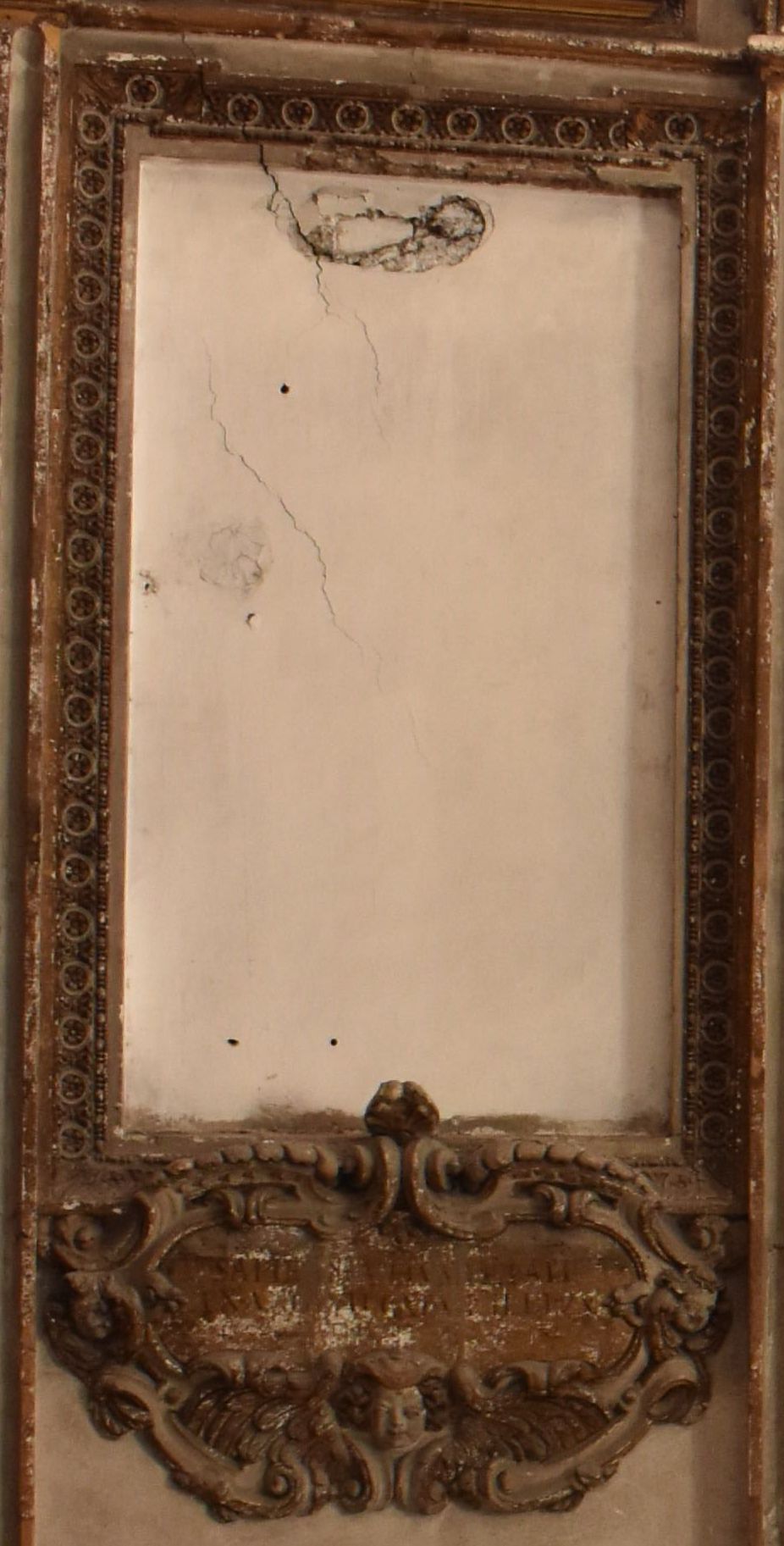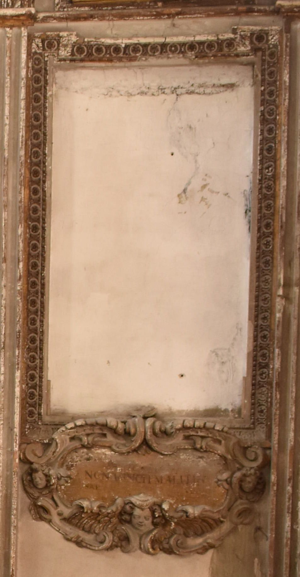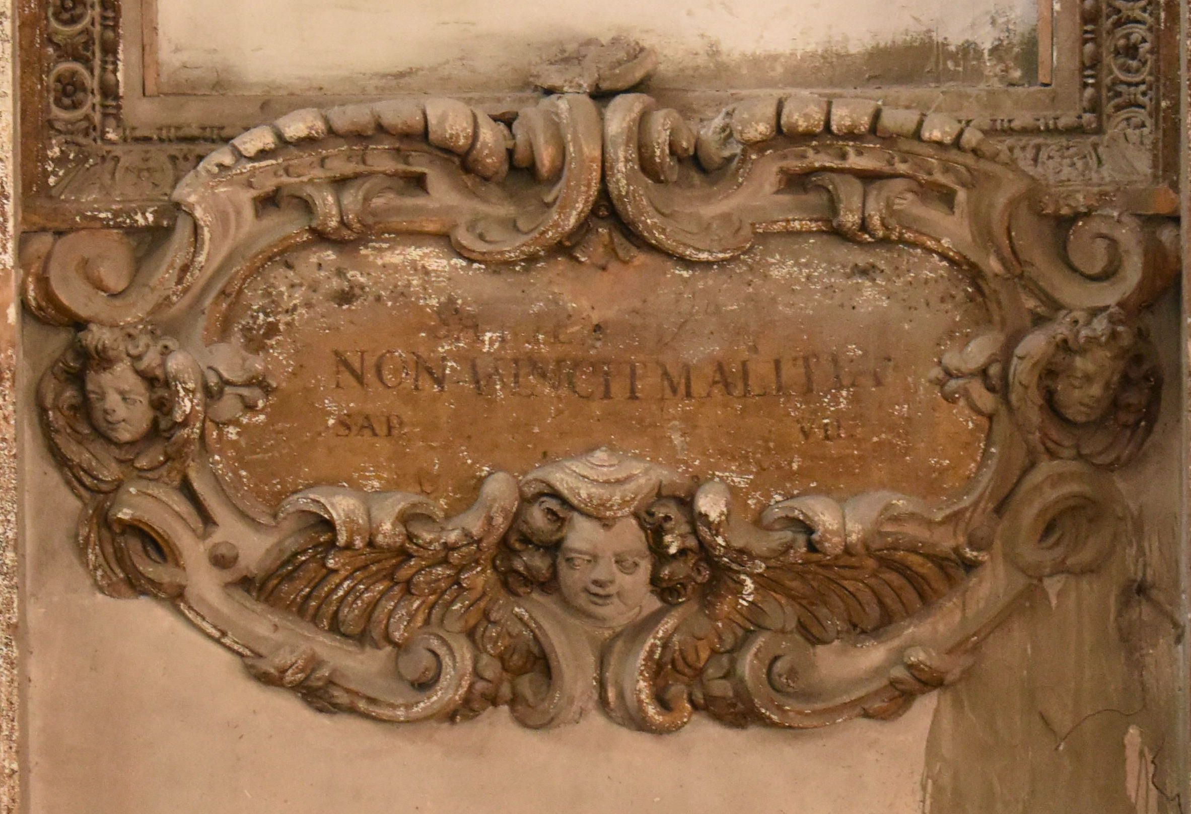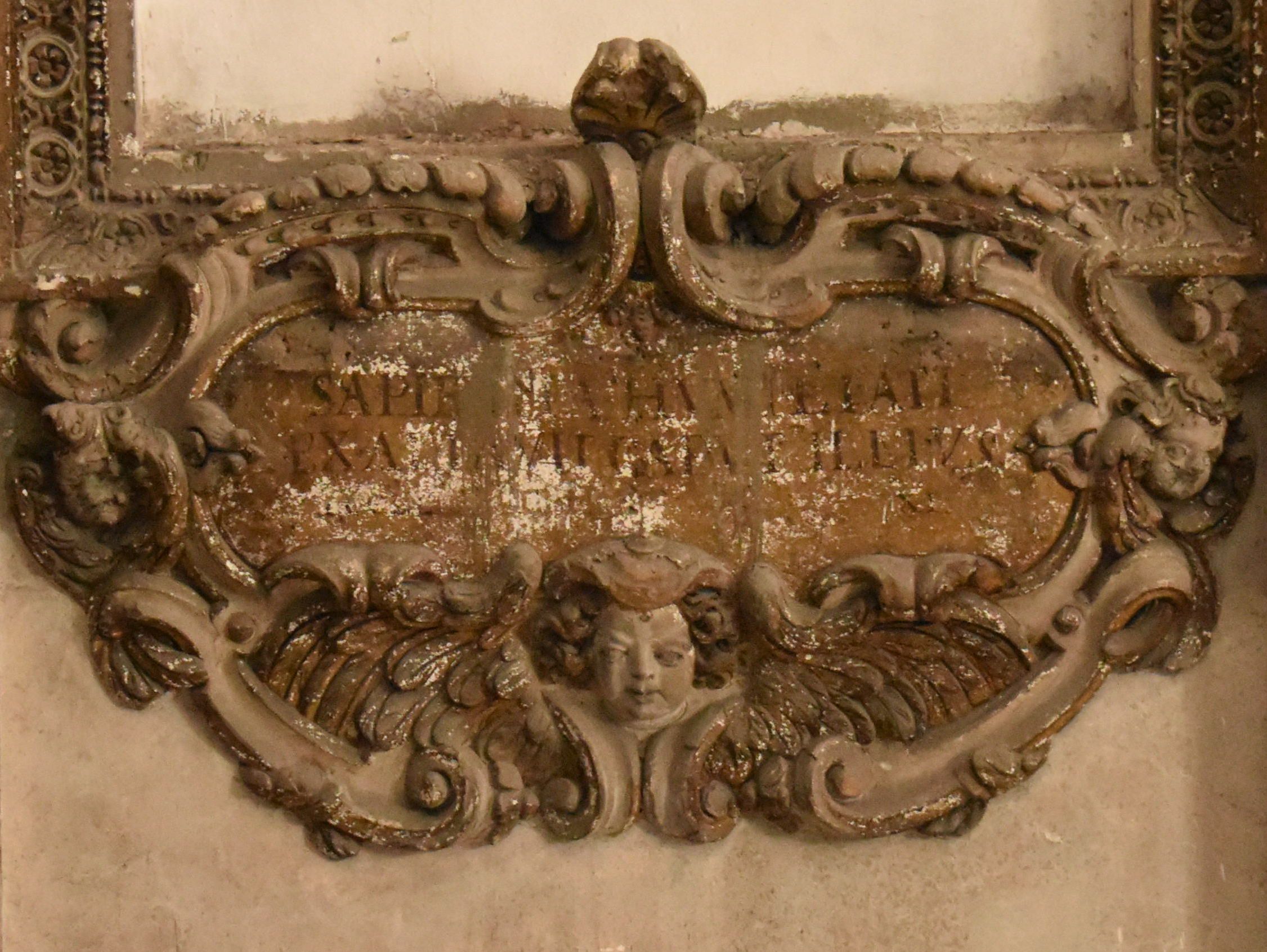 Medaglione con volute, decorato, nella parte inferiore, da una testa di cherubino incorniciata da ali spiegate, e recante un'iscrizione dipinta