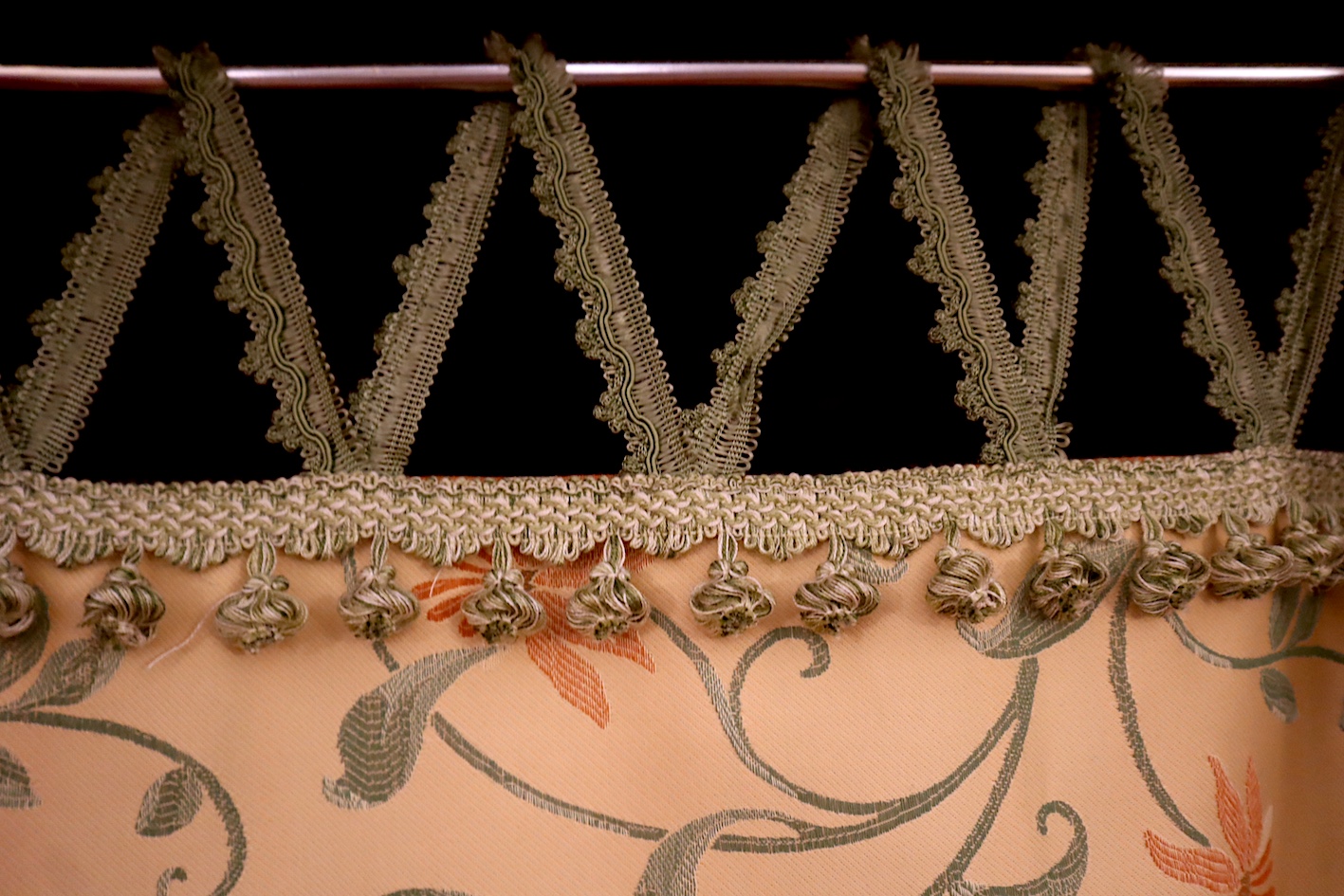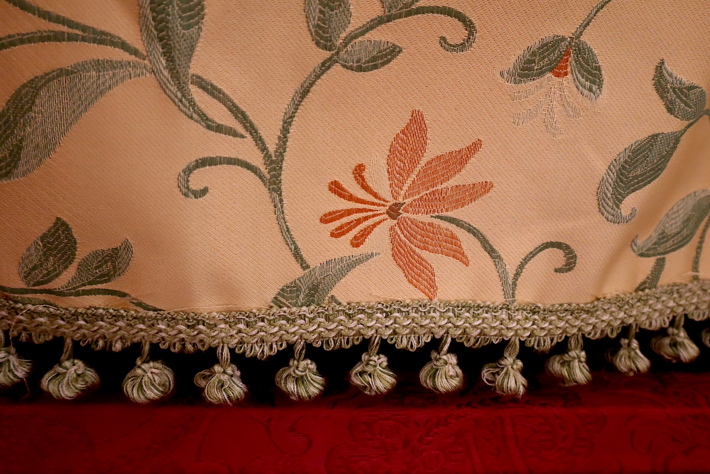 Parokhet in gros de tours con trame broccate. Disegno a esili tralci verdi da cui fiori di color rosa e pistilli rossi con andamento sinuoso a sviluppo verticale. Corre lungo tutti i lati della tenda una banda in mereletto in filo di seta verde tessuto al telaio filato con testa gallone liscia e gonna postiglionata a nappe. Passanti in merletto in filo di seta verde. Fodera in raso arancio