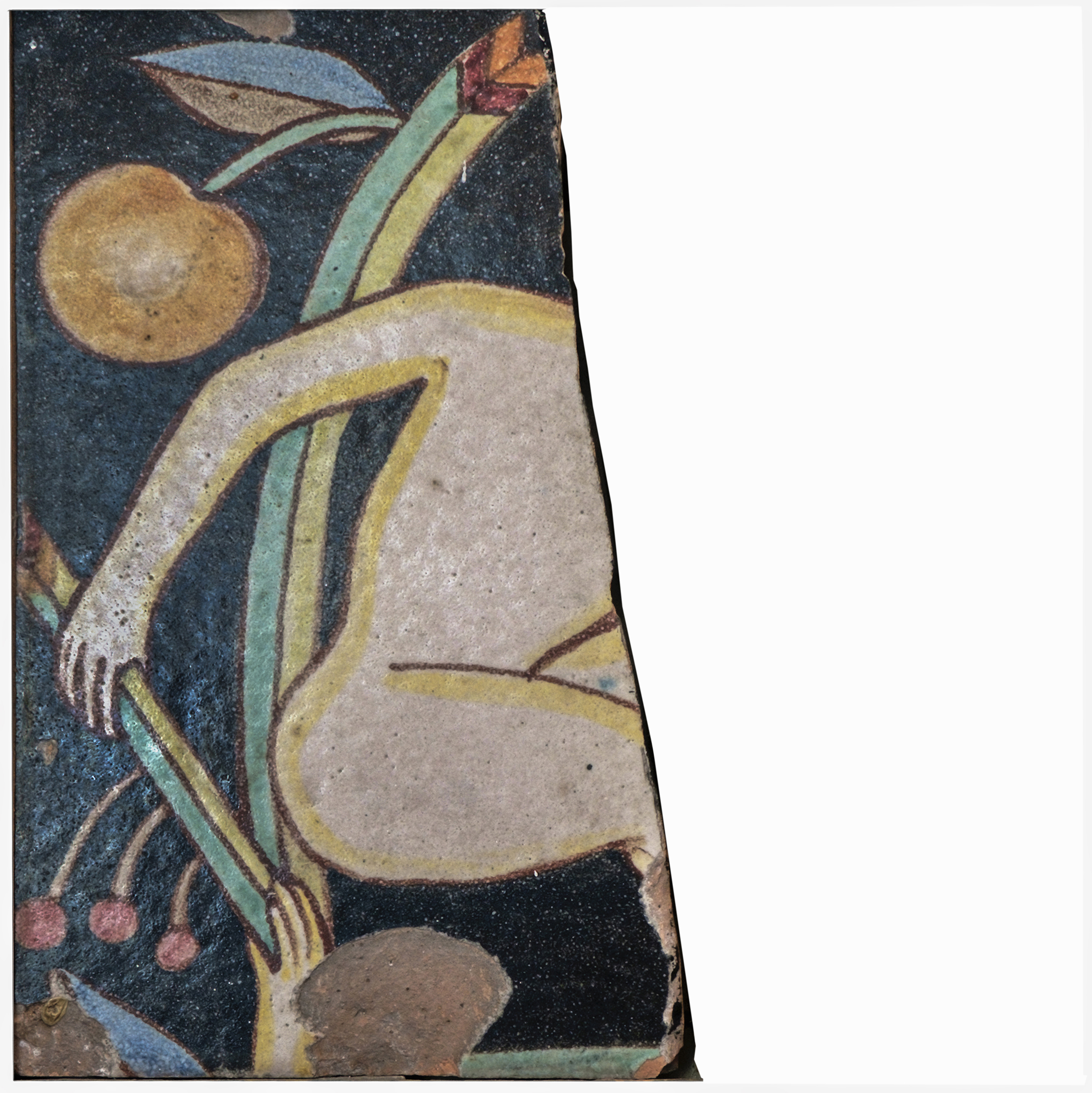 - NOTIZIE STORICO CRITICHE Frutto di donazione, il pannello era in un primo momento diviso in due pannelli distinti rispettivamente di due e 3 piastrelle. Ricongiunto poi con il ritrovamento di una sesta piastrella mancante nel centro. Evidente in questo pannello l'ispirazione al pannello del Profeta Jonas (inv. 37)di Richard Dölker. Come si può osservare, le qualità espressive contenute sono molto diverse da quelle tipiche dell'artista tedesco. Manca infatti la fluidità dell'impianto disegnativo che il Dölker usa per conferire un armonioso dinamismo al complesso compositivo. Interessante è invece osservare come il gusto "tedesco" trovi dei seguaci in Vietri e ciò denota interesse per un ampliamento del repertorio caratteristico di questo centro ceramico
