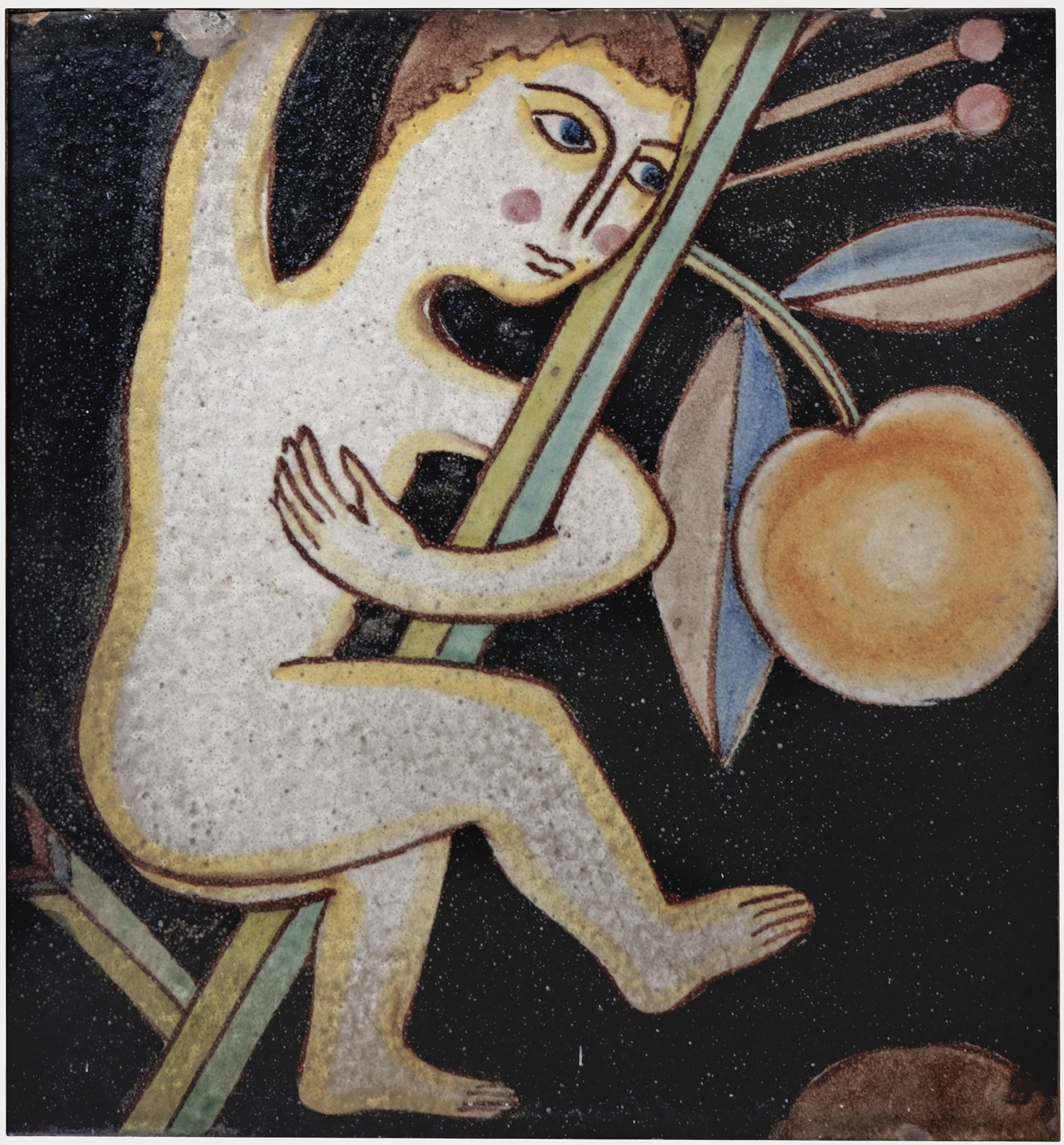 - NOTIZIE STORICO CRITICHE Frutto di donazione, il pannello era in un primo momento diviso in due pannelli distinti rispettivamente di due e 3 piastrelle. Ricongiunto poi con il ritrovamento di una sesta piastrella mancante nel centro. Evidente in questo pannello l'ispirazione al pannello del Profeta Jonas (inv. 37)di Richard Dölker. Come si può osservare, le qualità espressive contenute sono molto diverse da quelle tipiche dell'artista tedesco. Manca infatti la fluidità dell'impianto disegnativo che il Dölker usa per conferire un armonioso dinamismo al complesso compositivo. Interessante è invece osservare come il gusto "tedesco" trovi dei seguaci in Vietri e ciò denota interesse per un ampliamento del repertorio caratteristico di questo centro ceramico