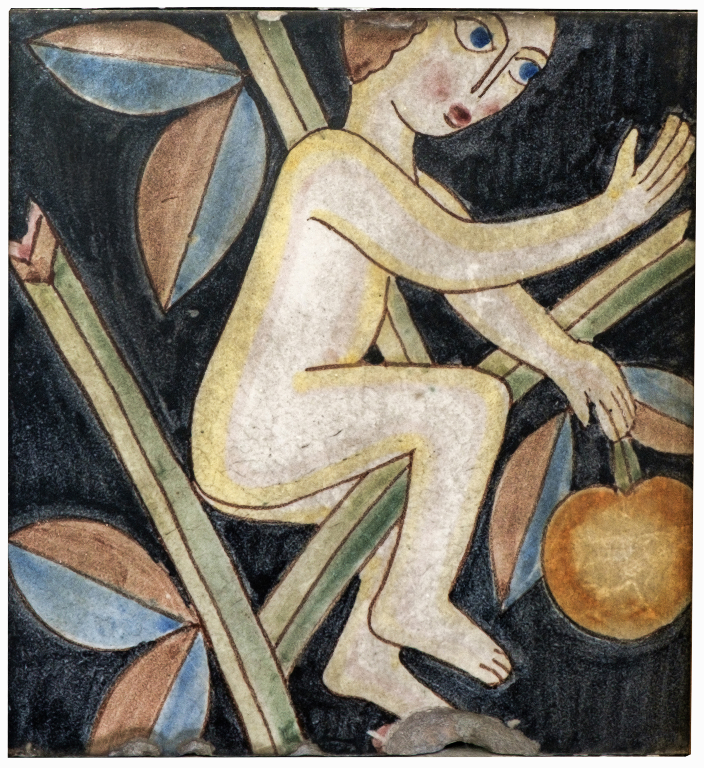 - NOTIZIE STORICO CRITICHE Frutto di donazione, il pannello era in un primo momento diviso in due pannelli distinti rispettivamente di due e 3 piastrelle. Ricongiunto poi con il ritrovamento di una sesta piastrella mancante nel centro. Evidente in questo pannello l'ispirazione al pannello del Profeta Jonas (inv. 37)di Richard Dölker. Come si può osservare, le qualità espressive contenute sono molto diverse da quelle tipiche dell'artista tedesco. Manca infatti la fluidità dell'impianto disegnativo che il Dölker usa per conferire un armonioso dinamismo al complesso compositivo. Interessante è invece osservare come il gusto "tedesco" trovi dei seguaci in Vietri e ciò denota interesse per un ampliamento del repertorio caratteristico di questo centro ceramico