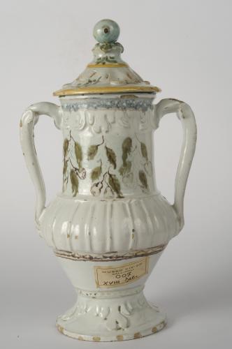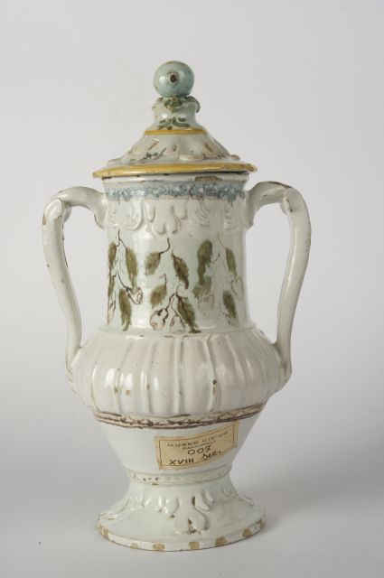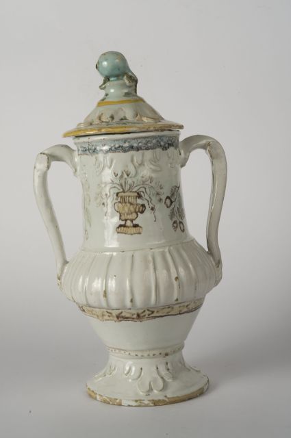 anfora con coperchio con pomello configurato a pera. motivi vegetali sul corpo