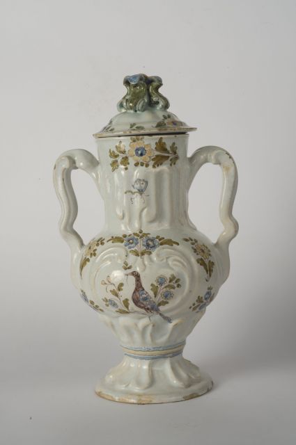 motivi faunistici e vegetofloreali sul corpo, sull'orlo e sul coperchio