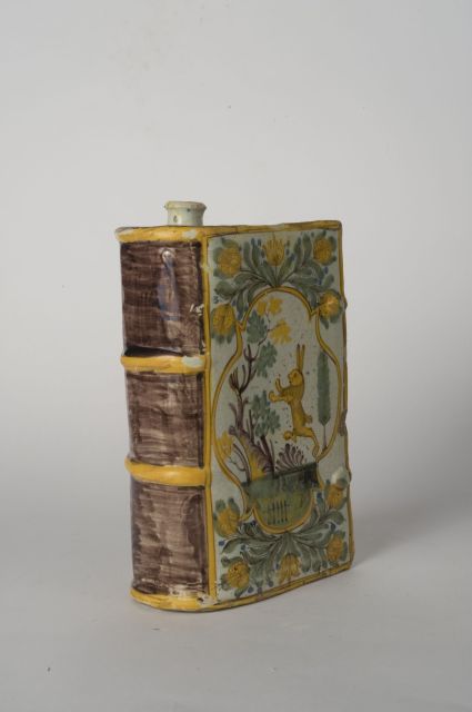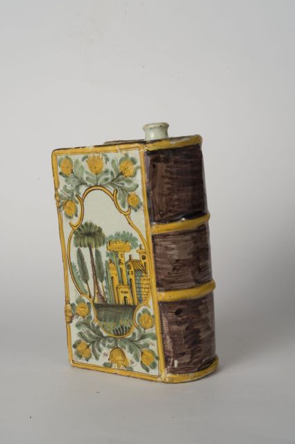fiasca. fiasca configurata a libro; sulle coperte paesaggio stilizzato e scena campestre