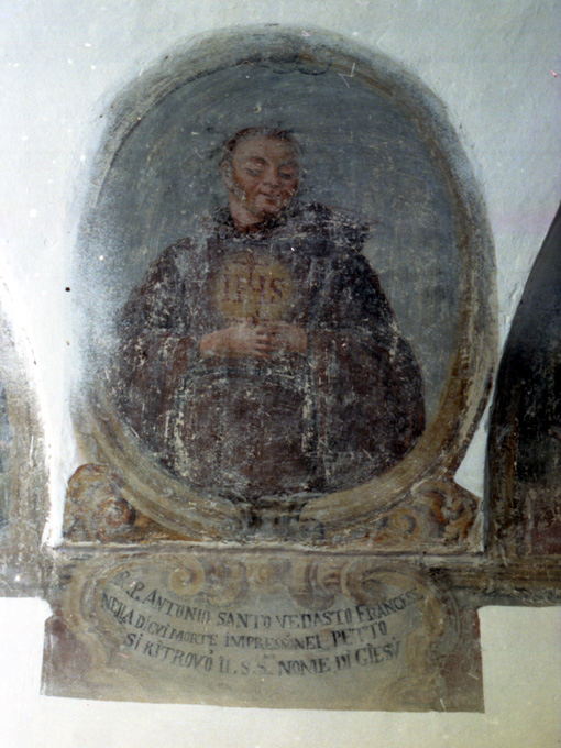 - ISCRIZIONI nel cartiglio in basso - R.P. ANTONIO SANTO VEDASTO FRANCESE / NELLA DI CUI MORTE IMPRESSO NEL PET O / SI RITROVO' IL SS.MO NOME DI GIESU' -