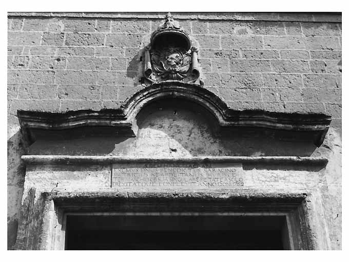 - ISCRIZIONI entro specchio epigrafico - AEDEM HANC SACRAM/ EXCMUS DNUS BENEDICTUS SARACINUS/ PATRICIUS NEAPOLITANUS HUIUSCE/ TERRAE MARCHIO OB SUA SINGULARE PIETATE A SOLO/ EREXIT ATQUE COMPLEVIT ANNO DNI 1762 - lettere capitali - a solchi - latino