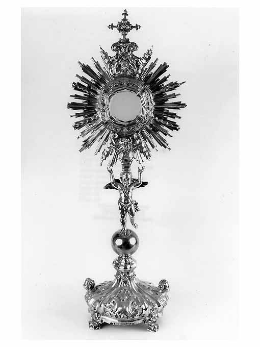 Base circolare con piedini sagomati a volute vegetali; collo modanato attraversato da nervature verticali, decorazioni a girali vegetali, palmette e testine angeliche aggettanti. Nodo a globo. Fusto figurato. Ricettacolo a raggera,con fasci di raggi lanceolati; teca a luce tonda e decorazioni a fogliette. Fastigio con baldacchino decorato a volute; crocetta di avellana apicale raggiata