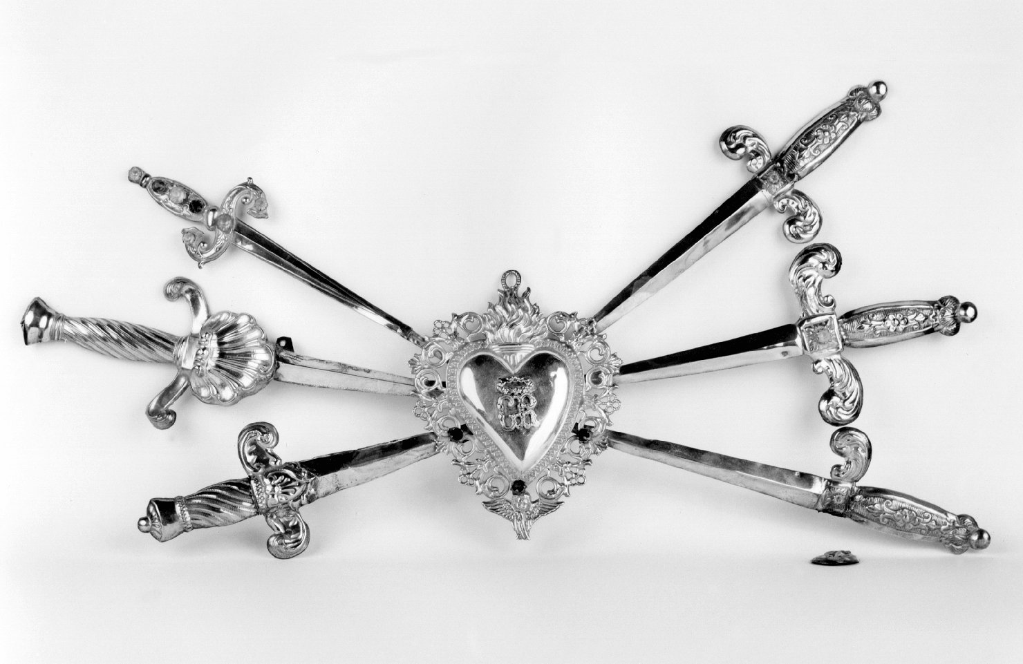 cuore fiammeggiante; bordo orlato da motivi a ovoli e palmette decorato con castoni gemmati e volute vegetali terminanti inferiormente con un cherubino; nel campo monogramma a rilievo; anello apicale; n. 6 spade con else di varia foggia e decorazioni a volute e motivi vegeto-floreali, due delle quali recano gemme incastonate