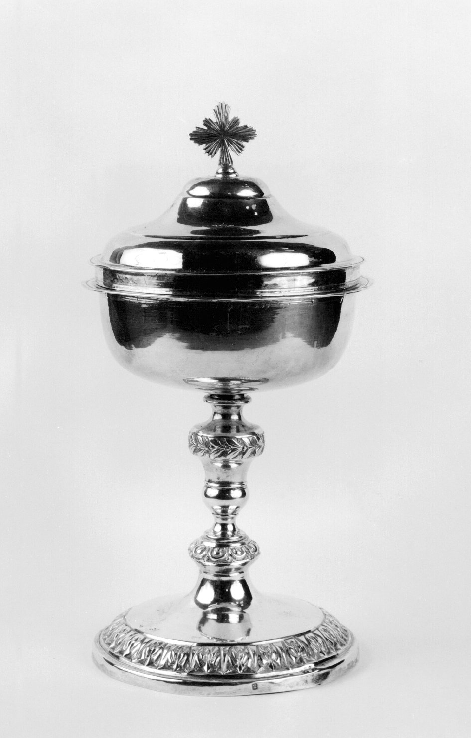 Piede circolare modanato, fusto modanato, nodo piriforme; coppa emisferica; coperchio modanato, crocetta apicale raggiata. Decorazione: motivi vegetali sul piede; motivi ad ovoli sul nodo