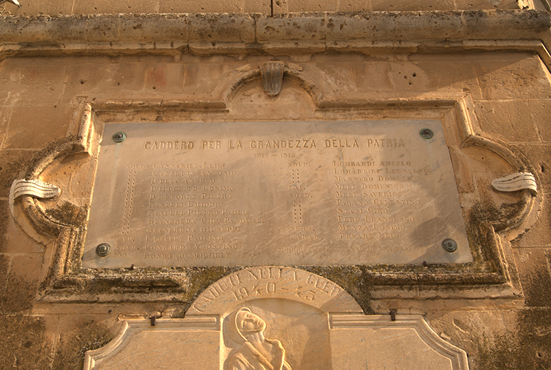 - ISCRIZIONI iscrizione su torre dell'orologio/ in alto al centro/ direzione NO - CADDERO PER LA GRANDEZZA DELLA PATRIA / 1915 – 18 / SOLD. CANNARILE LUIGI / ‘ ‘ (SOLD.) CAZZETTA ANTONIO / ‘ ‘ (SOLD.) D'ELIA ANGELO / ‘ ‘ (SOLD.) D'IPPOLITO COSIMO / ‘ ‘ (SOLD.) D'ETTORRE PIETRO / ‘ ‘ (SOLD.) FANELLI EMIDDIO / ‘ ‘ (SOLD.) FANELLI PIETRO PAOLO / ‘ ‘ (SOLD.) GIANFREDA CIRO PASQUALE / ‘ ‘ (SOLD.) GIANFREDA GIUSEPPE / CAP. LACAITA PAOLINO / SOLD. LONBARDI AGOSTINO / ‘ ‘ (SOLD.) LONBARDI MICHELE / SOLD. LOMBARDI ANGELO / ‘ ‘ (SOLD.) LOMARTIRE LEONARDO / ‘ ‘ (SOLD.) MASSARO DOMENICO / CAP. MELE DOMENICO / SOLD. MELE SAVERIO / ‘ ‘ (SOLD.) PAGANO CELESTINO / ‘ ‘ (SOLD.) STASI CIRO / ‘ ‘ (SOLD.) PERO' FRANCESCO / SERG. MENZA COSIMO / CARAB. PESARE LUIGI / TORRICELLA 4 11 ANNO III ERA FASCISTA - capitale - a niello -