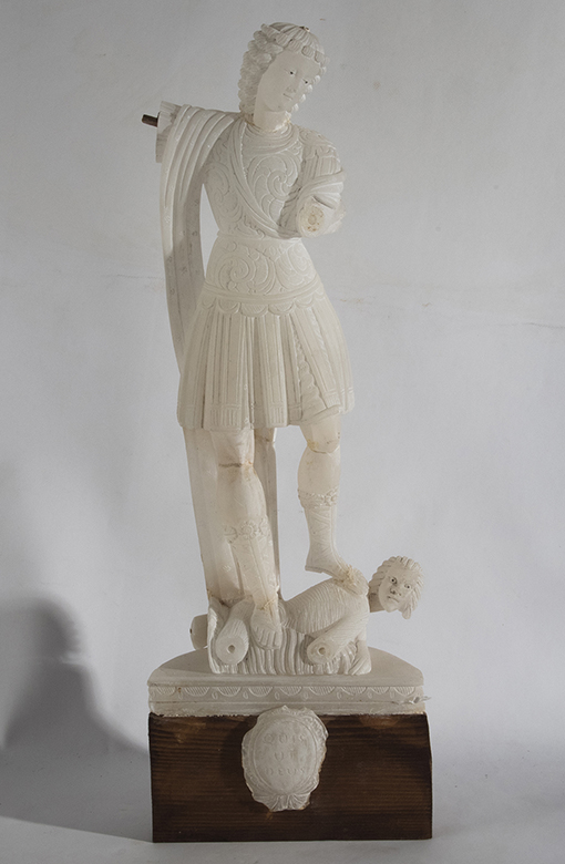 base lunettata; figura scolpita a tuttotondo con armatura e peplo che combatte il diavolo sottostante i piedi dell'angelo; braccio dx, alto sulla testa, braccio sx flesso sul busto; capo con ricca acconciatura riccioluta; scudo rimontato alla base