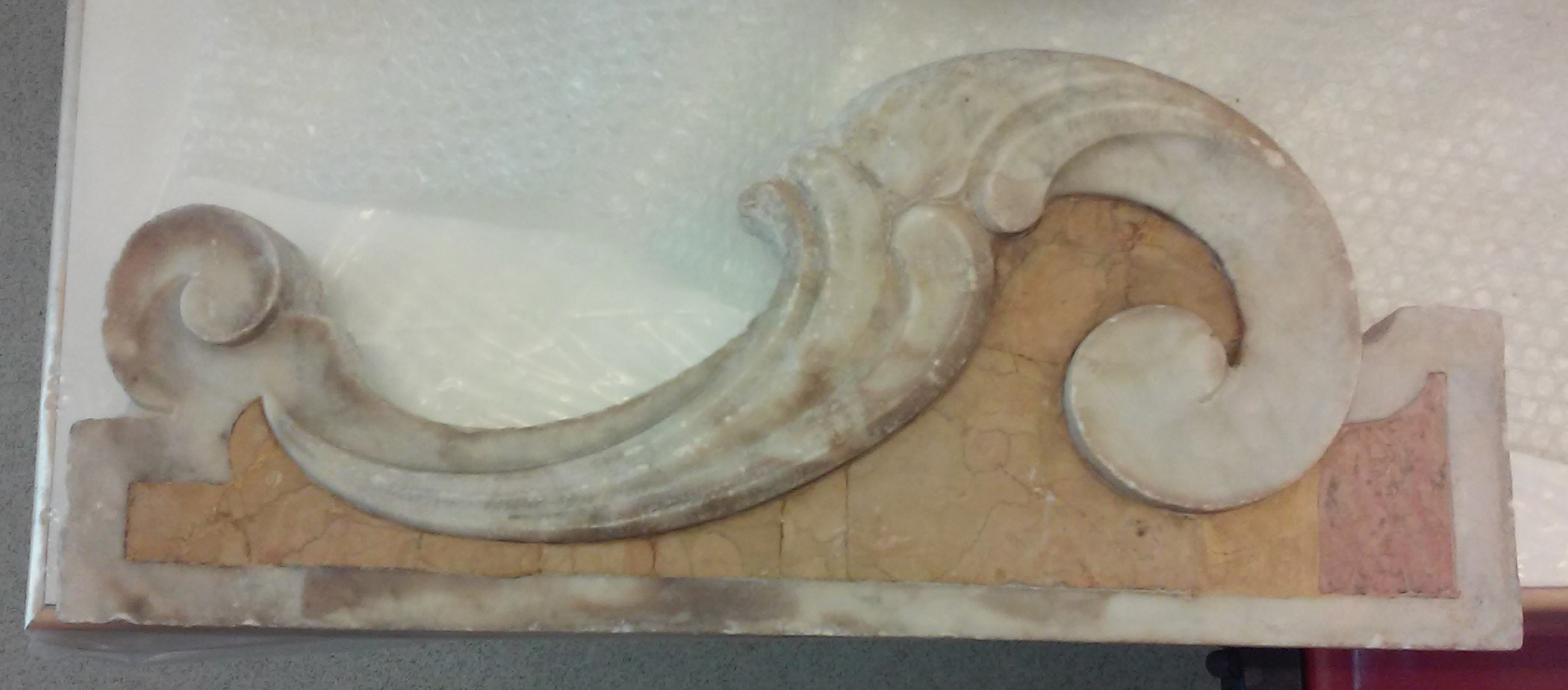 Mensola con volute inverse in marmo e intarsi in marmi policromi