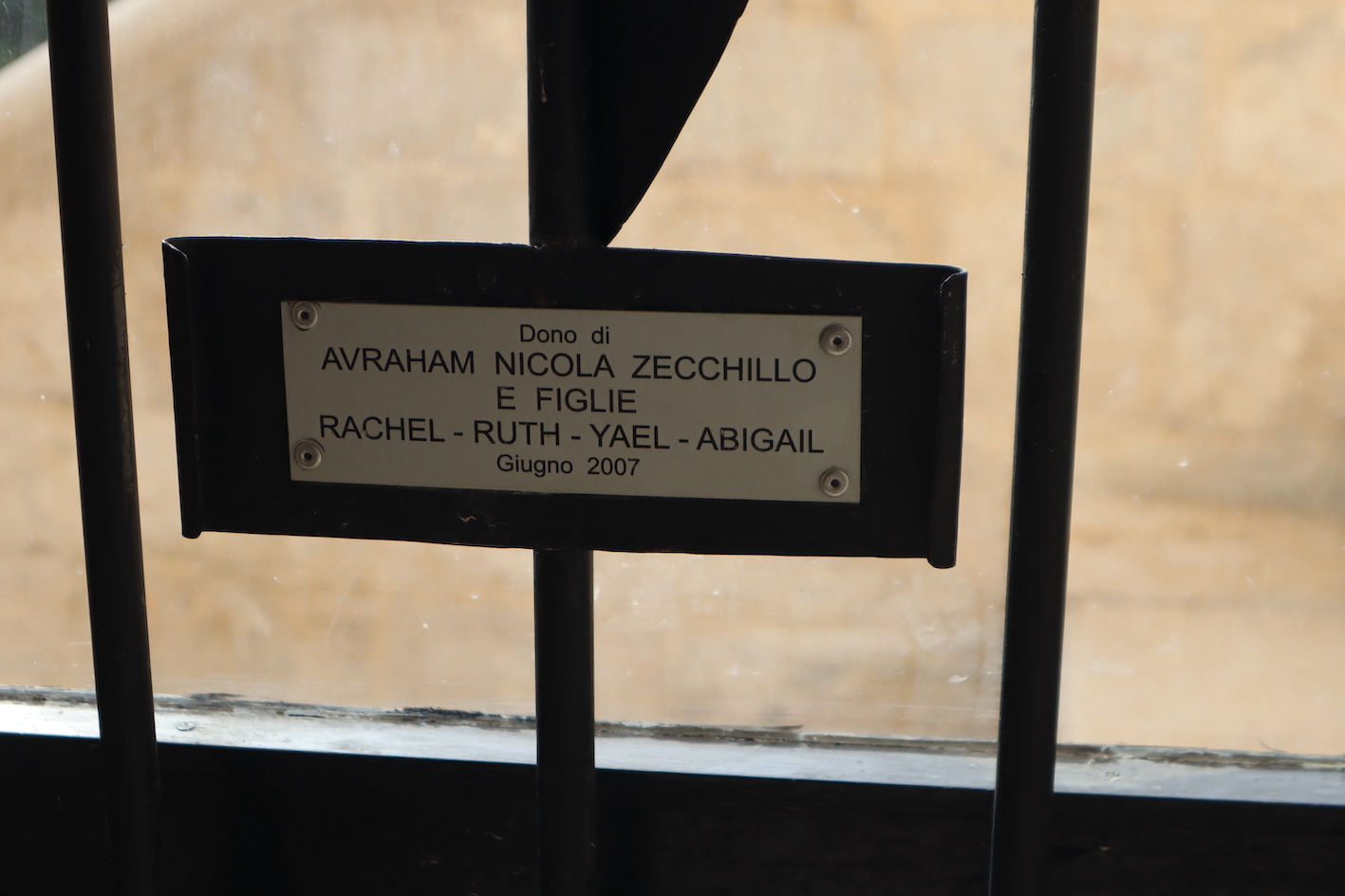 Grande monofora in ferro battuto di color nero. La superficie è scandita da tubi verticali e centralmente da una grande spiga di grano sormontata da una Stella di David a sua volta affiancata da elementi decorativi di forma triangolare