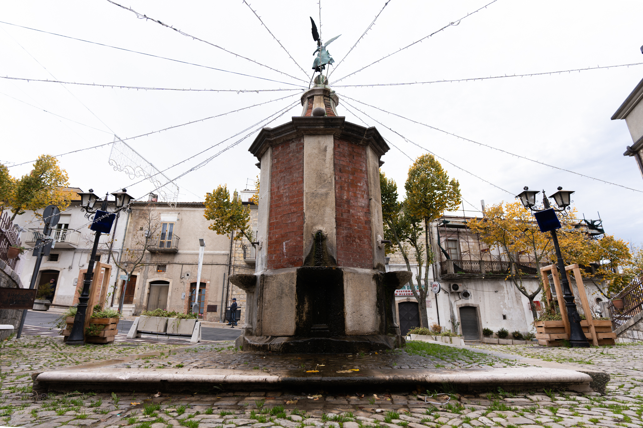 - NOTIZIE STORICO CRITICHE La fontana venne ricostruita nel 1898, per volontà del neoeletto sindaco Giuseppe Ernesto Maffia, su una precedente struttura edificata dal Comune nel 1862 con una spesa complessiva di 1500 ducati e inaugurata il 27 ottobre dello stesso anno. La Vittoria alata in bronzo posta sulla sommità della struttura diede il nome alla fontana, chiamata appunto ‘della Vittoria’, in seguito però impropriamente nominata ‘dell’Angelo’ per il vago richiamo della figura scultorea profana all’Arcangelo Michele, patrono della città di Orsara