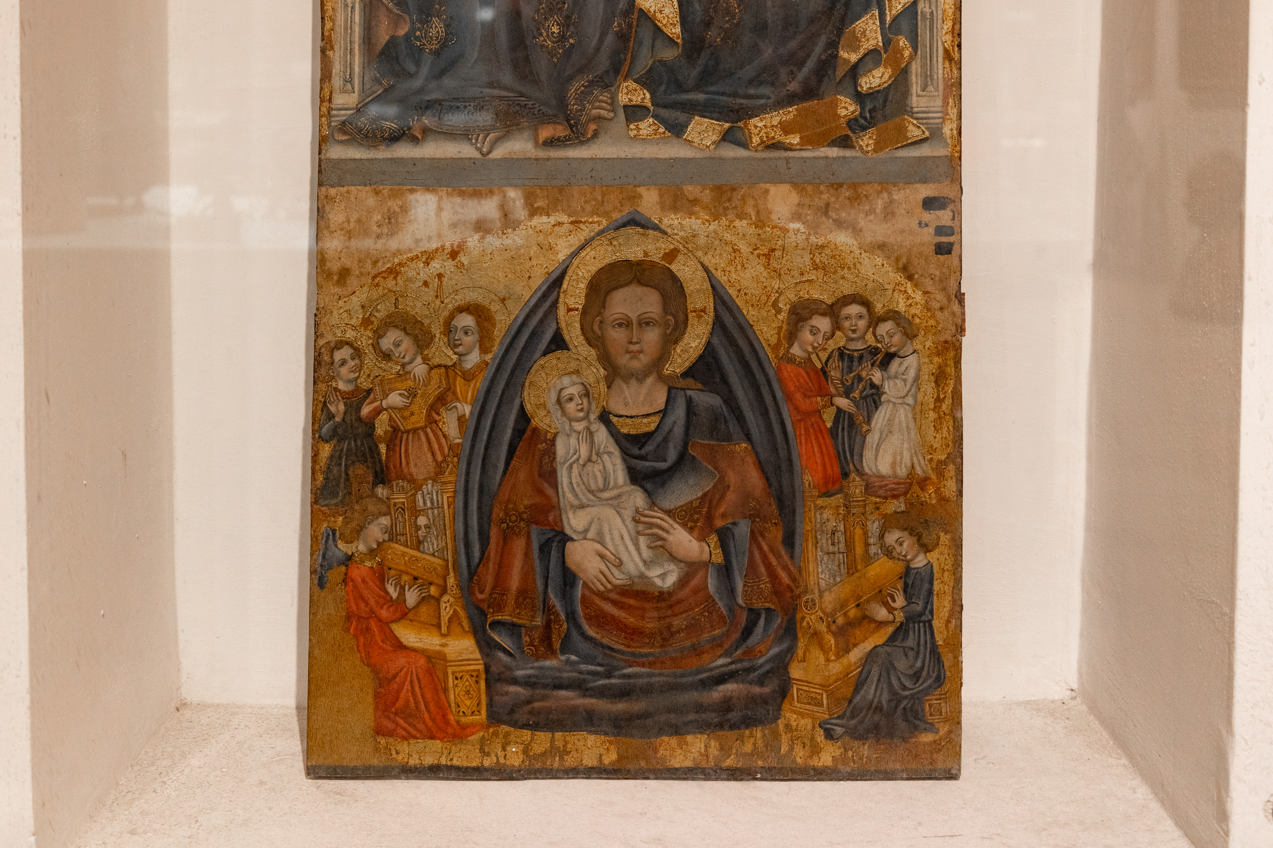 La tavola di dimensioni contenute, probabilmente parte centrale di un polittico di cui si sono persi gli altri pannelli e l’incorniciatura lignea, in origine doveva forse occupare un posto centrale della concattedrale di Barletta dedicata a Santa Maria Maggiore. Proprio la Vergine è infatti protagonista delle due scene sovrapposte del dipinto. La scena inferiore, con il Cristo in mandorla che regge l’animula della Vergine, presuppone la presenza di un perduto scomparto con la Dormitio; laddove l’anomala presenza nella porzione superiore di Maria assisa sul trono insieme alla Trinità, porterebbe a leggere la scena, più che come un’Incoronazione, come un’Assunzione della Vergine. Ciò giustificherebbe l’animata presenza nei due registri degli angeli musici e cantori, dipinti con particolare attenzione realistica e tecnica verso gli strumenti musicali, i gesti, le posture, indice di una conoscenza musicale diretta da parte del pittore o dell’utilizzo di precisi modelli raramente circolanti fuori dalle corti. Così se nella scena superiore quattro angeli ai lati del trono suonano la viella, la lira e un organetto portatile, in basso si svolge un doppio concerto di voci e strumenti a corda e a fiato. Ed è qui che si notano dei gustosi dettagli, come le gote gonfie degli angeli che suonano il flauto e la ciaramella o lo specchio dell’angelo organista di sinistra che, permettendogli di guardare dietro, gli consente forse di seguire sia il celebrante che il canto del popolo