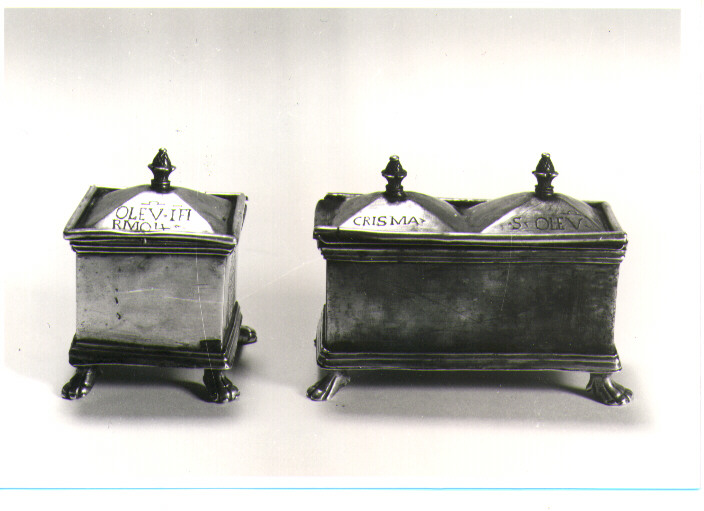 - NOTIZIE STORICO CRITICHE Il vasetto grande fu donato al Capitolo della Cattedrale Acheruntina da Mons. Giovanni M. Saraceno, che fu eletto Arcivescovo di Acerenza e Matera il 3 luglio 1531 dal Pontefice Clemente VII, e venne poi nominato Cardinale di Roma dal Pontefice Giulio III nel 1551 e dopo cinque anni, nel 1556, si dimise dal governo della Chiesa Acheruntina. Invece il vasetto cubico fu offerto da Mons. Sigismondo Saraceno nipote del Card. Giovanni M., che fu fatto venire nel 1557, per volontà del Sommo Pontefice Pio IV, presso la diocesi di Acerenza dopo la cessione della carica dello zio paterno. Resse la diocesi Acheruntina per ventotto anni, fino al 7 gennaio 1585, anno di sua morte avvenuta a Matera. Internamente il vasetto grande è diviso in due parti, in una si pone il crisma e nell'altra l'olio santo per i catecumeni. Di semplice fattura, privo di fregi decorativi, il vasetto ha l'arma eseguita in maniera rozza e rudimentale. Il vasetto cubico, in buono stato di conservazione, è simile al grande sul cui modello è stato eseguito; e, data la posteriorità d'esecuzione, l'arredo appare migliore sia nella decorazione dei piedini, molto dettagliati, che nella realizzazione dell'arma, più precisa e meno rozza