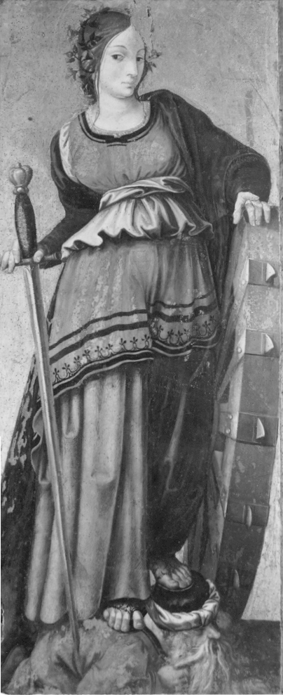 Personaggi: Santa Caterina d'Alessandria. Attributi: (Santa Caterina d'Alessandria) ruota dentata; spada. Figure: re