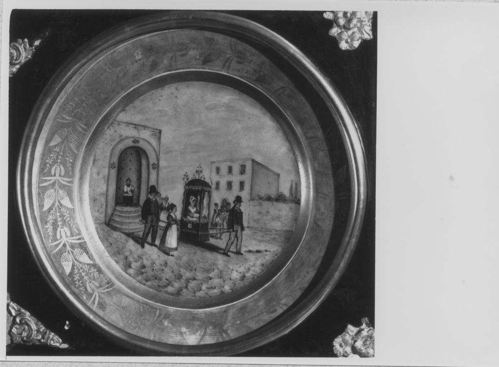 Soggetti profani: soggetti di genere. Figure: gentildonna; servi; donne; s acerdote. Architetture: chiesa; palazzo. Oggetti: portantina