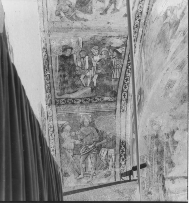 • NOTIZIE STORICO CRITICHE Le tre scenette illustrano tre episodi della vita di Cristo. Anche per essi, come per tutti gli affreschi della prima campata e per due scene nella volta della seconda ("Le nozze di Cana" e "La disputa con i dottori") si può affermare che siano la ridipintura ottocentesca di affreschi del XVI secolo, completamente perduti, di cui però l'ignoto frescante del del XIX secolo ripetè l'impaginazione compositiva, all'epoca evidentemente ancora riconoscibile. Gli stessi affreschi ottocenteschi risultavano, prima del recente restauro, alterati da volgari integrazioni, oggi eliminate