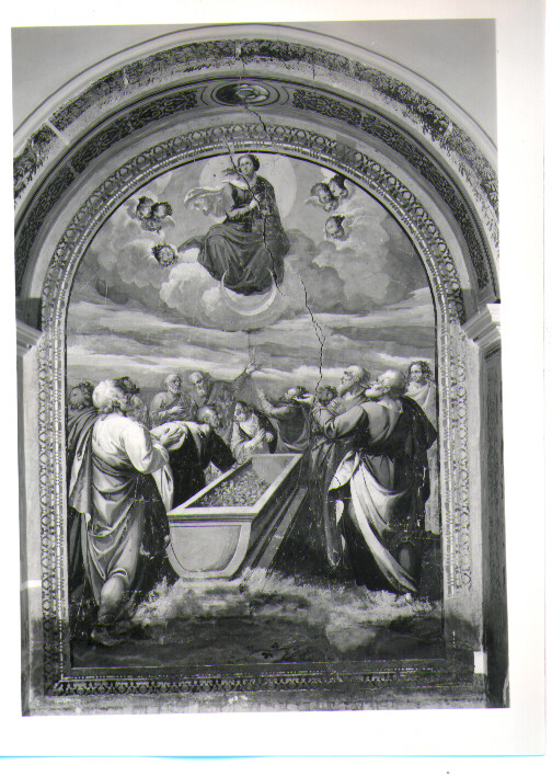 La Madonna è in alto, seduta sopra le nubi e una falce di luna; nella parte inferiore del dipinto c'è il gruppo degli Apostoli intorno al Sepolcro vuoto