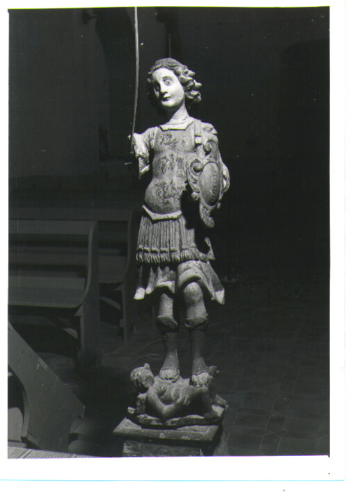 - NOTIZIE STORICO CRITICHE Particolarmente venerato dal V secolo in poi (V. Monte S.Agelo al Gargano), il culto dell'Arcangelo Michele, qui vestito da guerriero (fa parte delle milizie celesti), tradizione continuata dai "Sanmichelari" pugliesi, è molto diffuso a sud. In parte i longobardi hanno contribuito alla diffusione di tale culto, quindi i Carolingi, che, investitolo di un significato in ispecie apotropaico, ne hanno messo l'immagine nelle porte della città. Mentre nell' Italia del Nord e nelle zone transalpine il culto del San Michele, come immagine apotropaica, va gradualmente, dal medioevo in poi, sostituita da una grande figura di San Cristoforo e sulle porte delle città(v. la Svizzera) e nelle facciate delle chiese( v. affreschi medievali in Trentino, p.e.), nell' Italia meridionale è stato sempre vivo in quanto legato a credenze esoteriche di origine ancora pagana. In questa chiesa l' Arcangelo era particolarmente venerato com'è attestato, oltre che dalla presenza di questa scultura, in altre immagini in pittura e nella citazione della lapide del 1604. L'esecuzione, alquanto ingenua, sottolinea, nella vittoria del Bene sul Male, gli aspetti i più immediati dell'immagine, quelli che maggiormente fanno presa sulla psiche umana