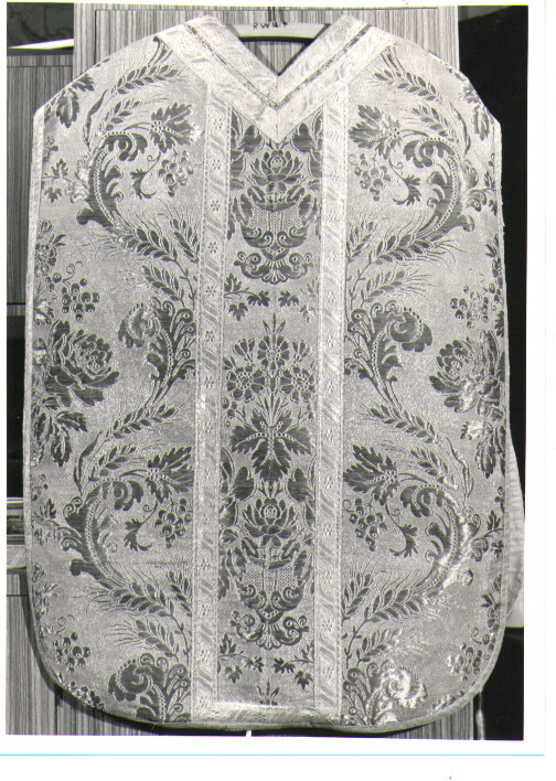 Parato liturgico composto di una pianeta, stola, un manipolo ed un velo da calice. Su un fondo interamente spolinato in oro sono tessuti fiori, spighe e motivi fogliacei; le guarnizioni ed i galloni sono in cotone color giallo-oro, la fodera è rossa