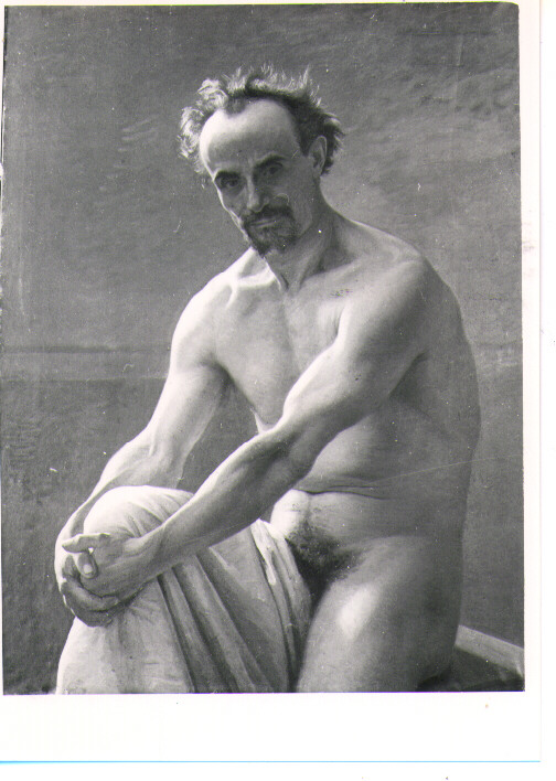 Su un fondo luminoso è rappresentato ignudo, con barba, coperto sulla gamba destra da un panno con profonde pieghe, un uomo. Egli flette lievemente il busto in avanti e stringe, con le mani, il ginocchio destro volgendo il capo verso sinistra accennando ad un sorriso