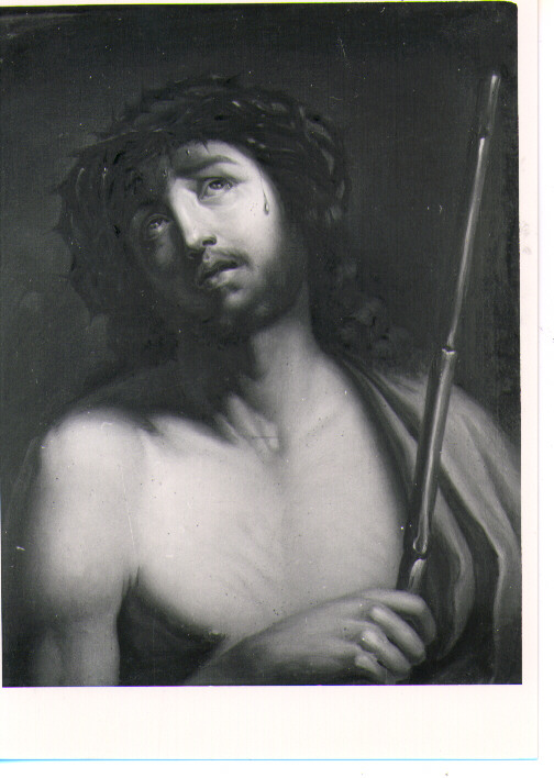 Su un fondo scuro è rappresentato a mezzo busto il Cristo col capo coronato di spine, avvolto da un mantello che gli ricade sulla spalla sinistra. Egli volge in alto lo sguardo e reca nella destra un bastone