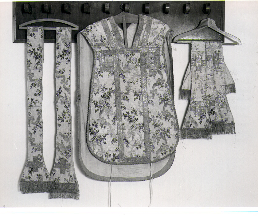 Il parato è composto da una pianeta, un piviale, due tonacelle, due stole, tre manipoli. I paramenti sono realizzati in tessuto bianco, broccato in oro e colori. Il ricamo è costituito da motivi vegetali, operati a colori e legati da nastri in oro, che si svolgono in verticale ad andamento curvilineo; galloni in oro con rami fioriti