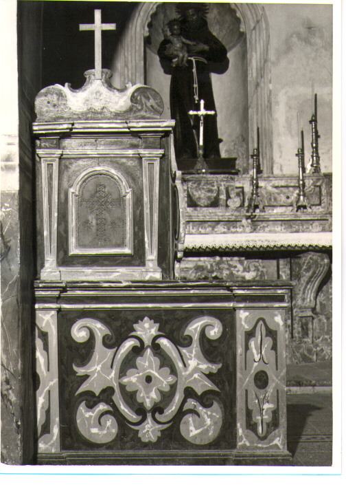Il confessionale ha finestrella fiancheggiata da due lesene rastremate in basso che reggono il fregio sovrastato da volute a croce terminale