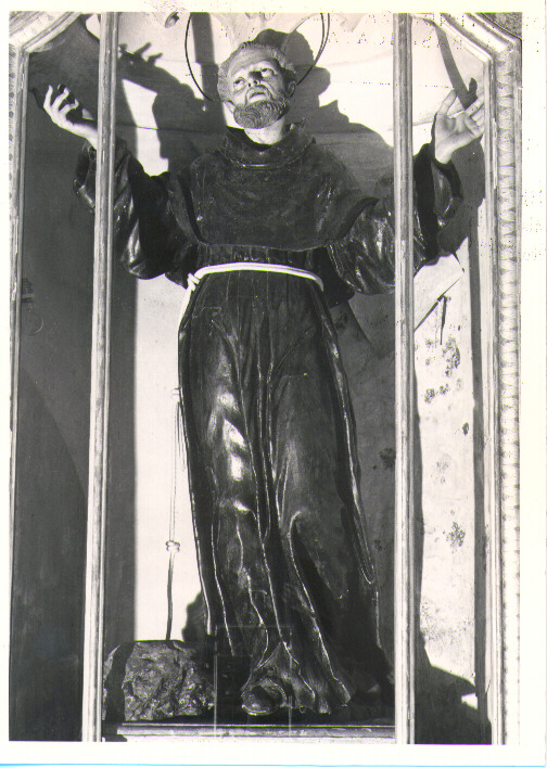 Il Santo, vestito col saio marrone, contempla il cielo a braccia aperte. Accanto, a sinistra, è un masso su cui era fissato un crocifisso ora mancante