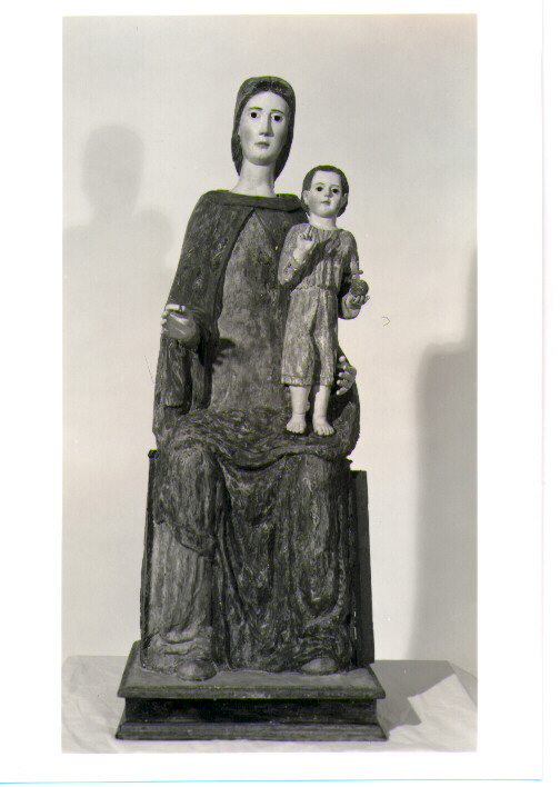 La Madonna siede su un trono del quale restano scarse tracce; è vestita di una tunica rossa e di un manto azzurro fermato sul petto. Un lembo del manto si ripiega intorno al braccio sinistro e le copre le gambe. Il braccio destro, accostato sino al gomito al corpo, si protende forse a sorreggere uno scettro, non più esistente. L'altra mano presenta il Bambino, raffigurato già adulto, benedicente, e con il globo cricifero, vestito di una tunica dorata e profilata di rosso