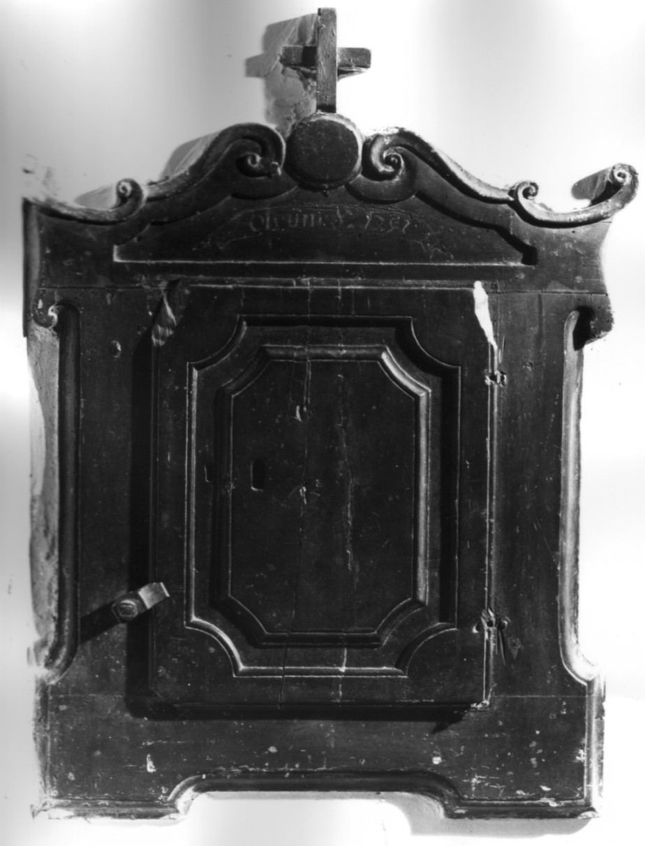 telaio di forma quadrangolare con cornici mistilinee e coronamento a volut e e croce apicale; sportello con due riquadri ottagonali concentrici con c ornici modanate mistilinee. Cartiglio intarsiato recante l'iscrizione. F ermo per lo sportello in legno; foro di serratura