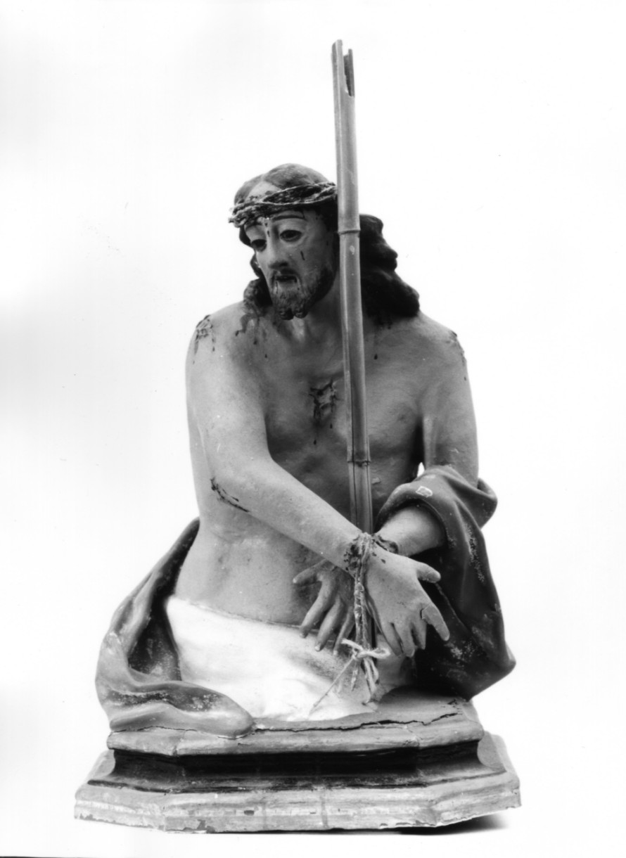 Cristo, il capo coronato di spine, nudo, coperto dal perizoma bianco e dal mantello di porpora che, poggiato attorno al braccio sinistro, avvolge i fianchi, ha le mani sovrapposte e legate dinanzi a sé con spago, reggono l a canna. Sul corpo sono evidenti le ferite della flagellazione e la coron a di spine posta sul capo genera copiose gocce di sangue