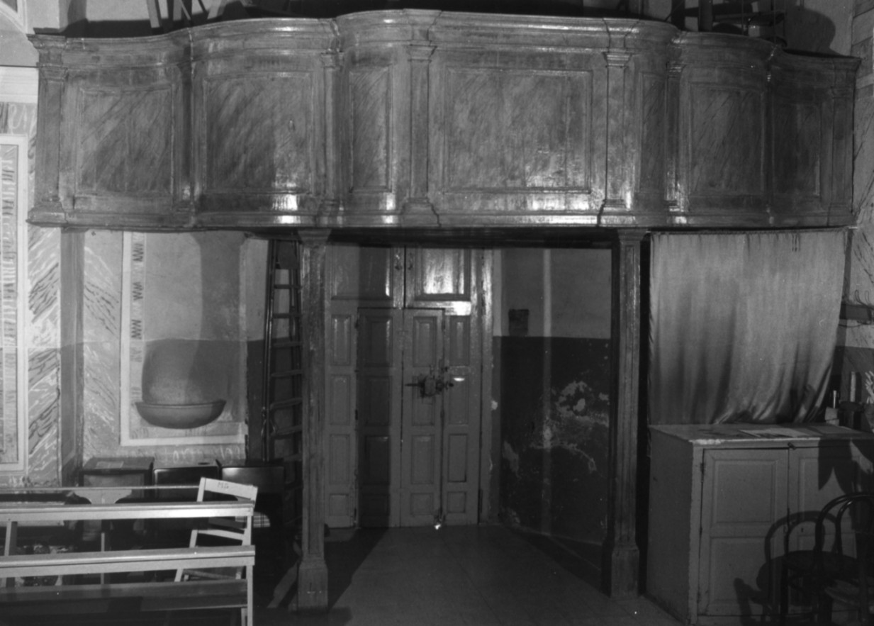 palco di cantoria con corpo centrale piano ed ali laterali dalle linee con cave-convesse, fronte divisa da lesene in sette settori con semplici specc hiature dipinte a finte venature lignee e cornici multiple modanate; sorre tto anteriormente da due esili pilastrini a sezione rettangolare