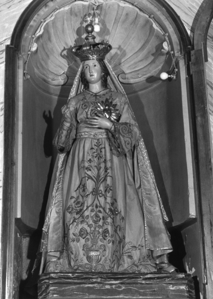 statua composta dal busto, capo, braccia e gamba destra in legno, rivestit a di cinque diversi strati di vestiti di cui l'ultimo (recente) di raso ro sa con ricamo di filo d'oro, velo bianco di tulle e manto di raso celeste, trapunto di stelle. Sacro Cuore di metallo e corona